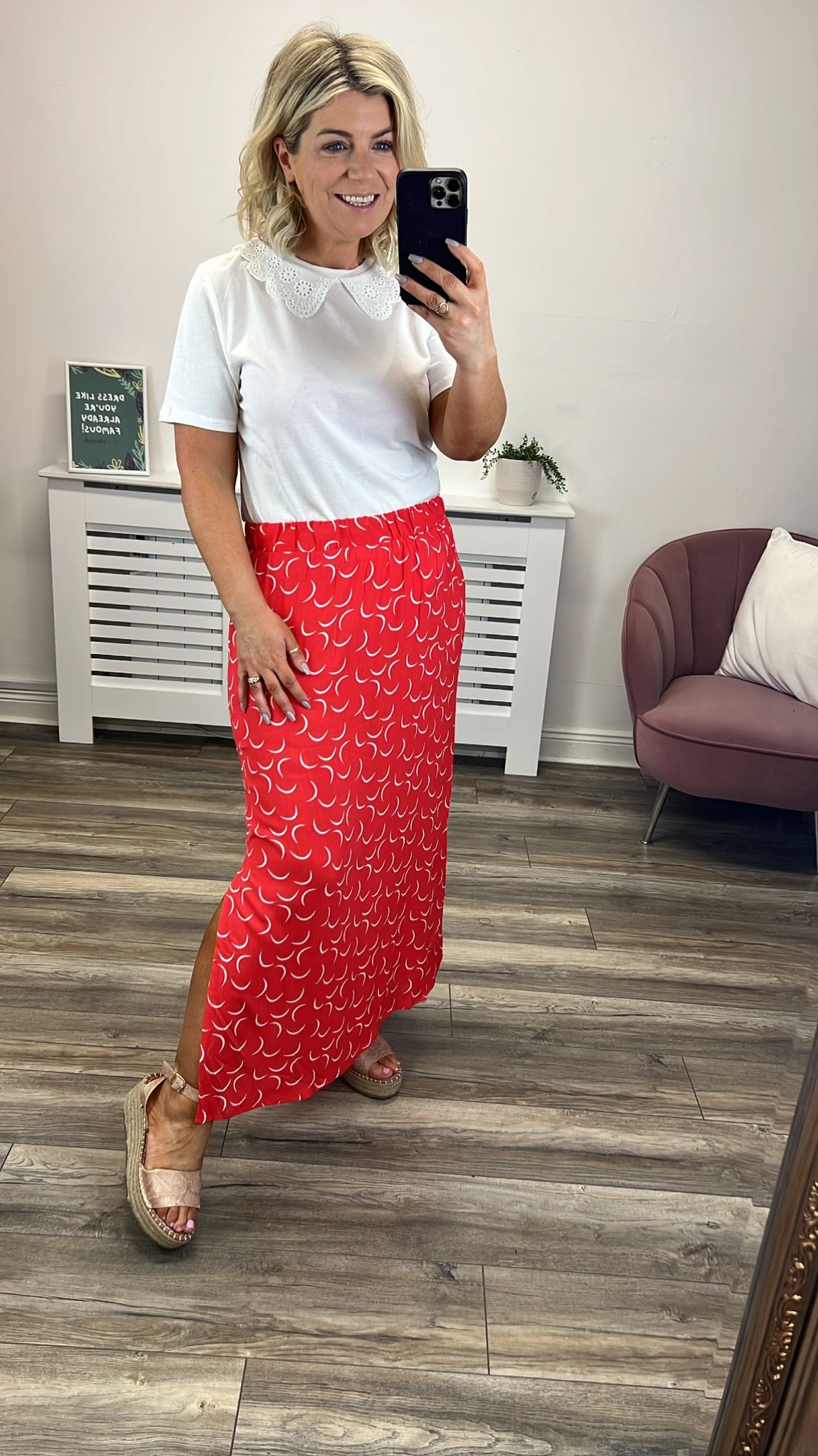 Our Marrakech Maxi Skirt is a classic shape with a moon print from Ichi. Pair with our Samantha O-Neck white T- shirt and white runners for a cute casual summer look.
