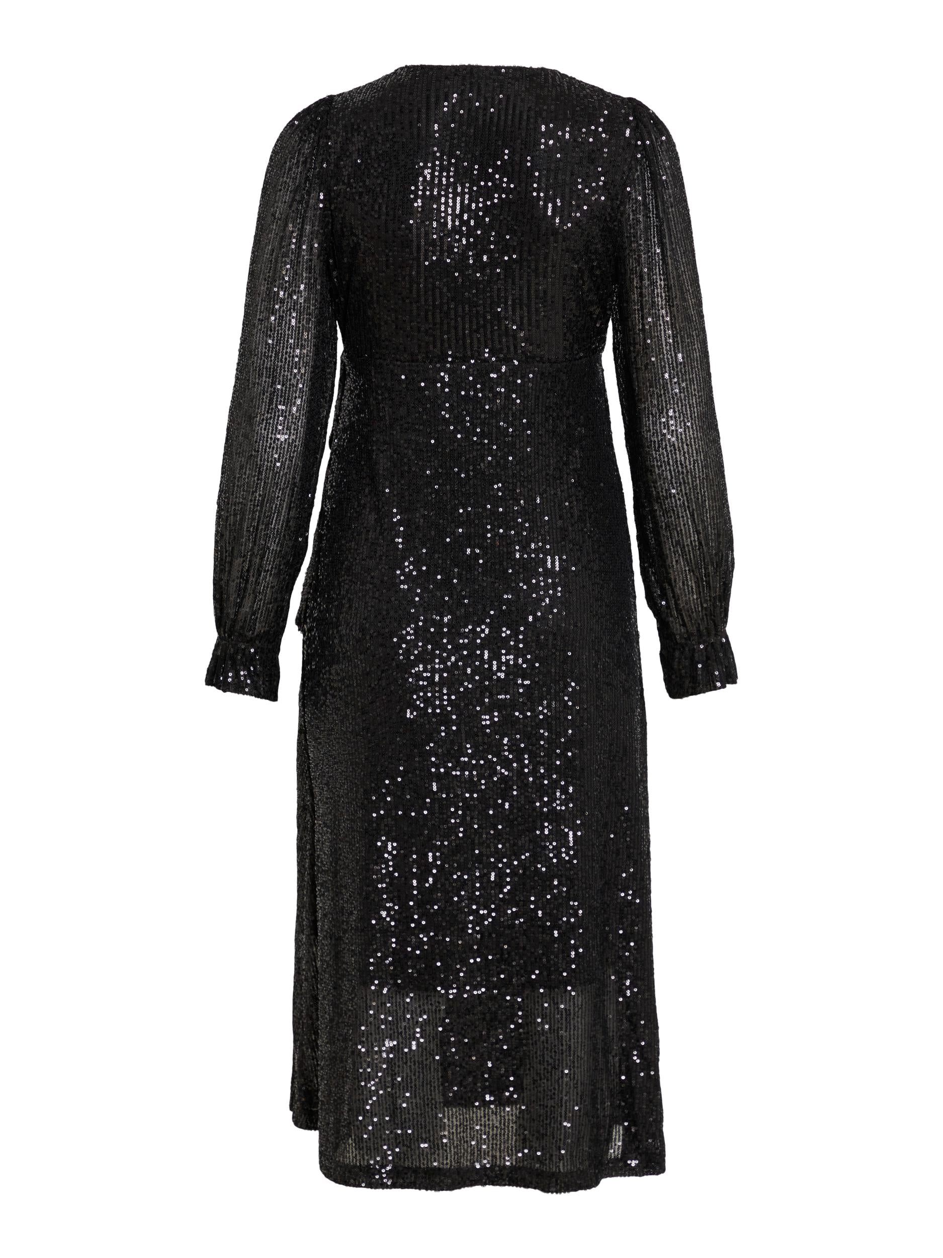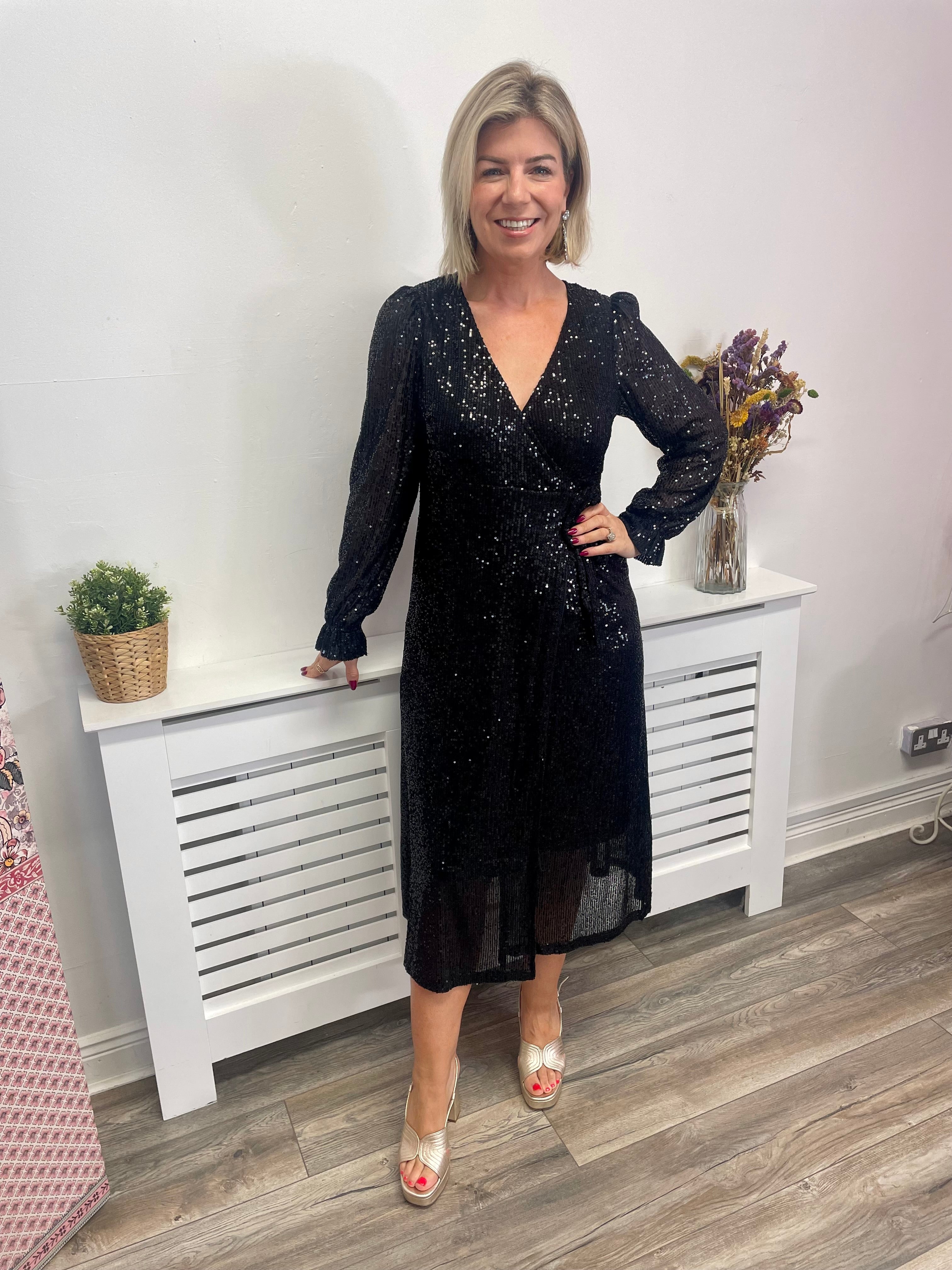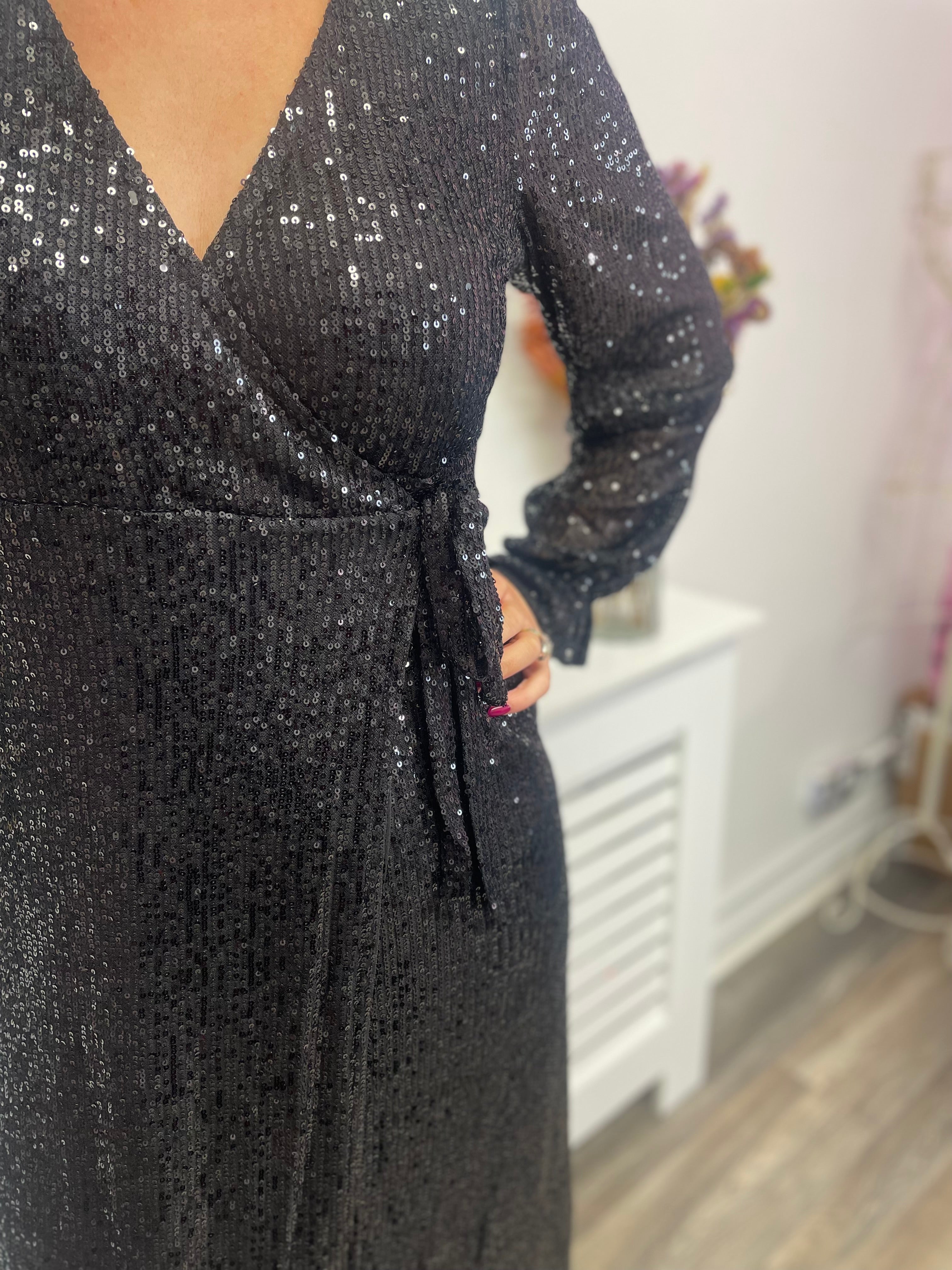 MIRA SEQUIN MIDI WRAP DRESS (BLACK)