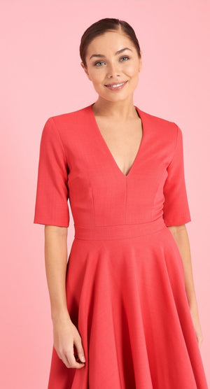 Meet one of our bestselling occasion dresses, the timeless, graceful and feminine Myla Dress. Made from a stretch luxe crepe featuring an elegant V-Neck fitted bodice, mid length sleeves which end just above the elbow, a full skirt with pockets and a concealed centre back zip.