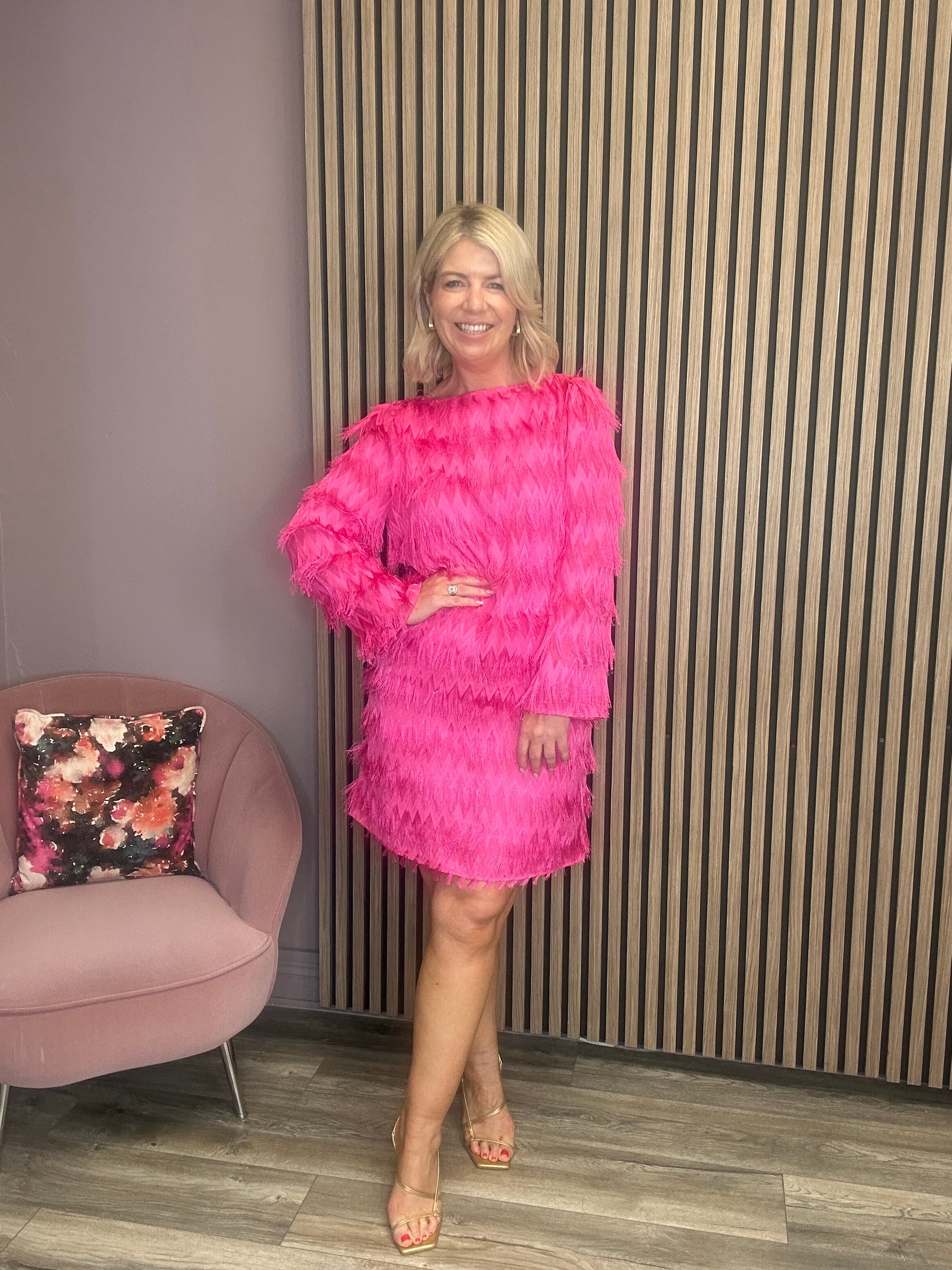 How cute is the Nell mini dress. With a round neck, long sleeves and all over fringing this little pink number is the prefect party dress.