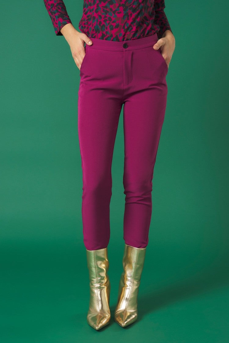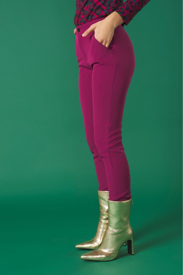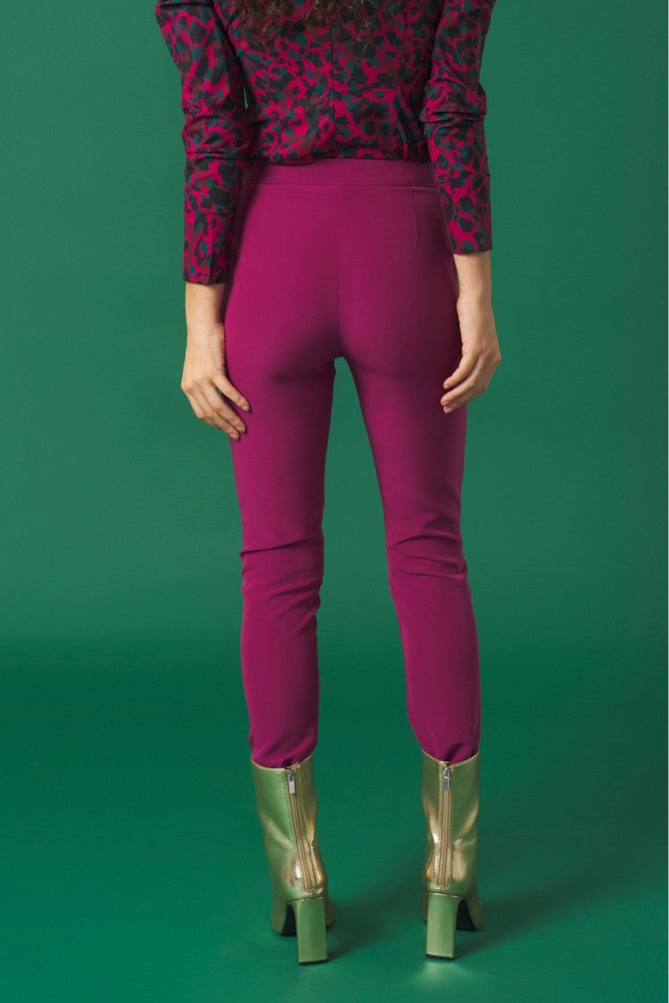 Tapered trousers feature faux pockets on the outside. Closure is secured with a button and zipper.