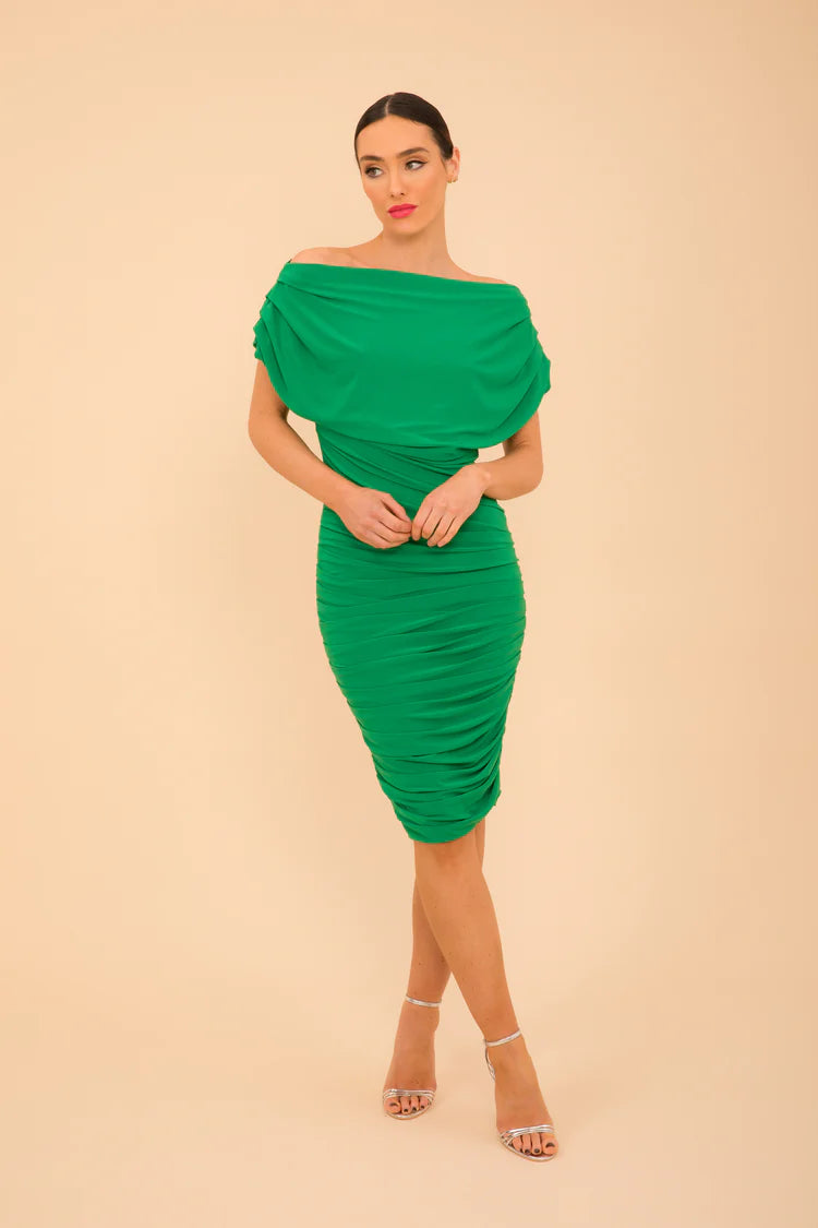 Striking off shoulder bodycon dress. Figure enhancing bodycon shape with flattering side pleat detail. Lined for comfort and support. This dress creates a stunning silhouette without clinging.