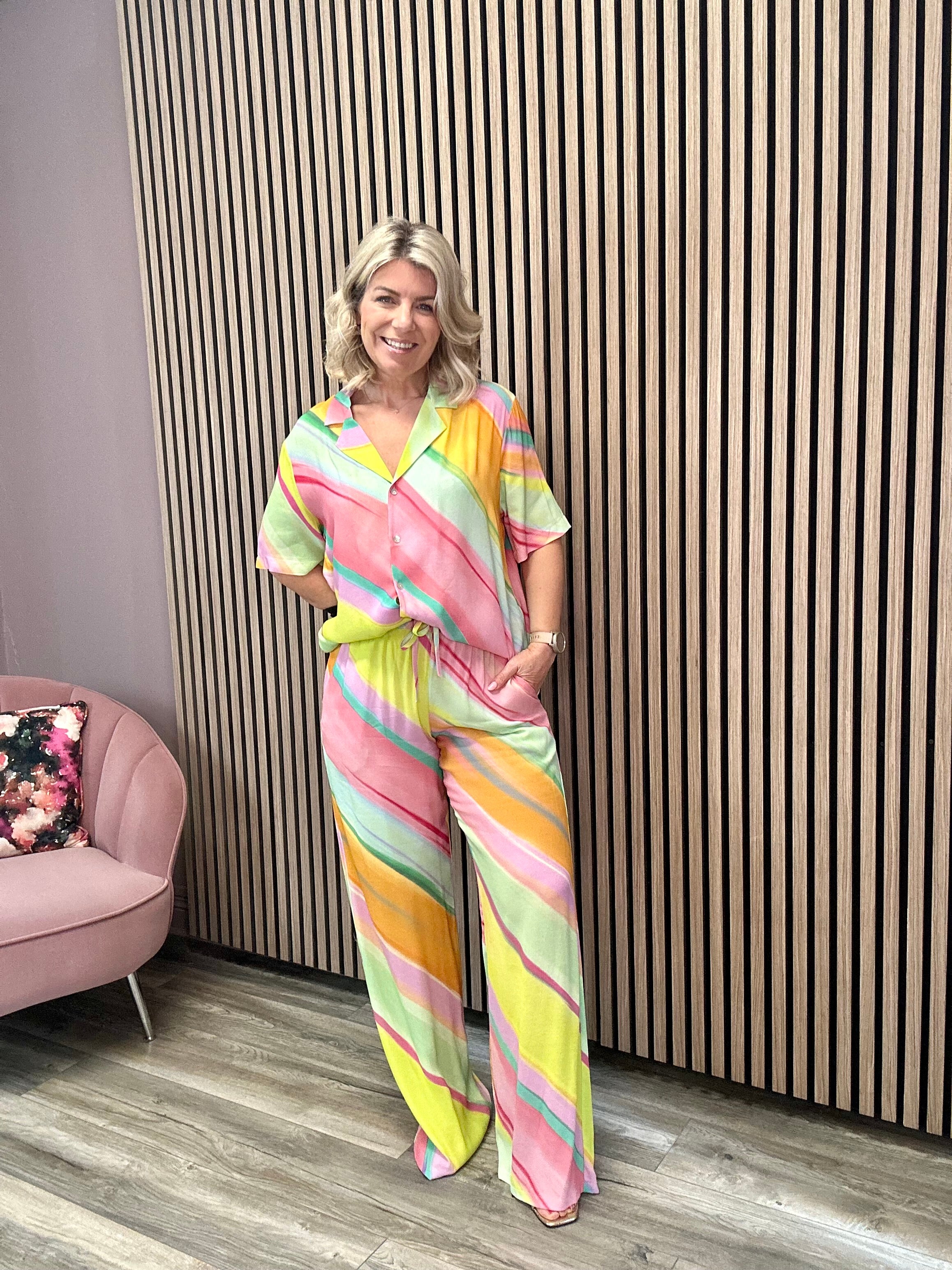 Achieve effortless style and comfort with our PACANIER Wide Leg Pants. The elasticated waist with drawstring ensures the perfect fit while the side pockets offer convenience. Made from a light flowing material, these pants feature a dynamic multicolour diagonal pattern for added flair.