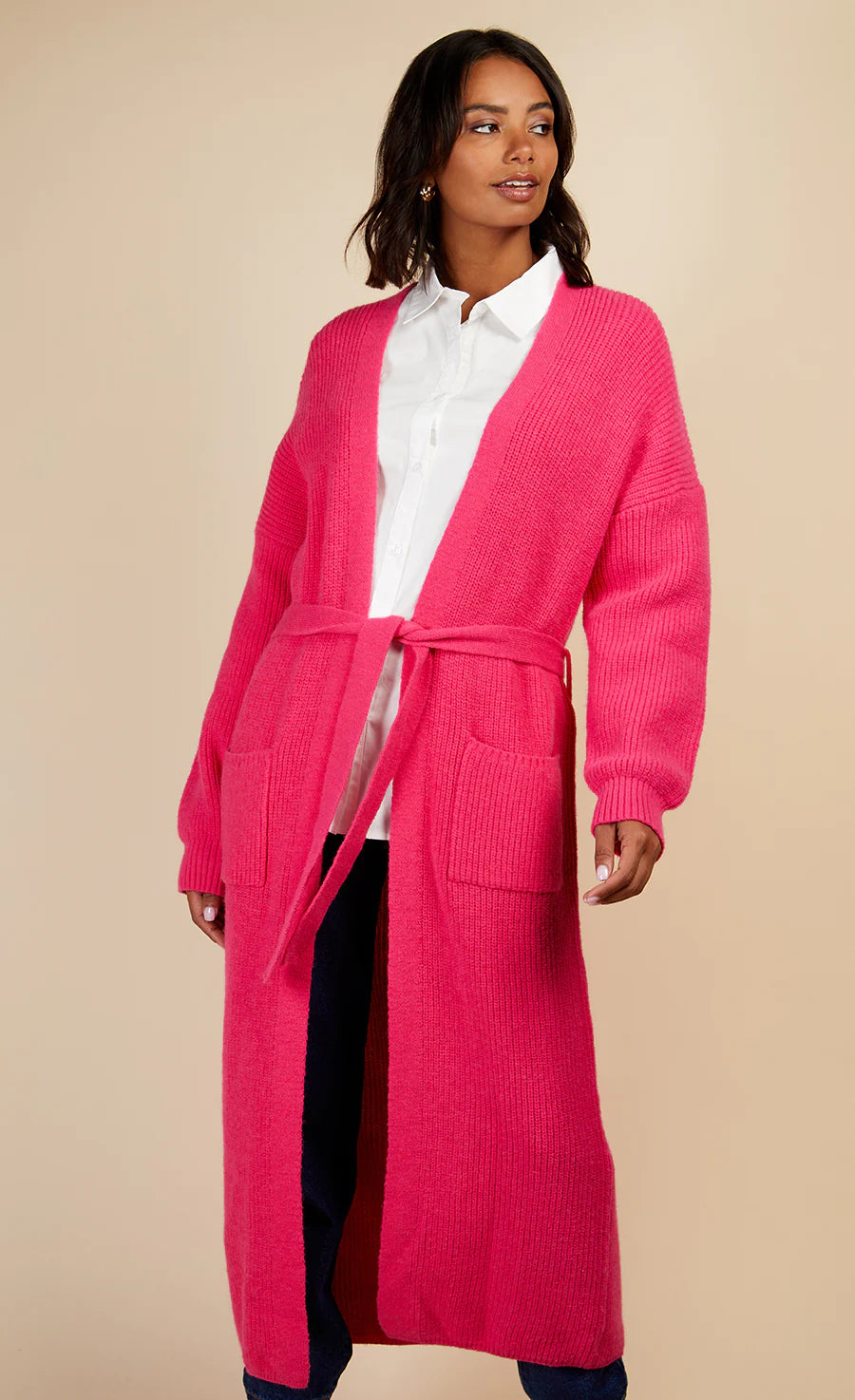 Longline knits are trending. Elevate your daytime look and add a bold pop of colour to your cold weather wardrobe with the POLY Longline Cardigan in the ultimate Barbie-pink colourway. Designed with a loose knit and self-tie waist belt.