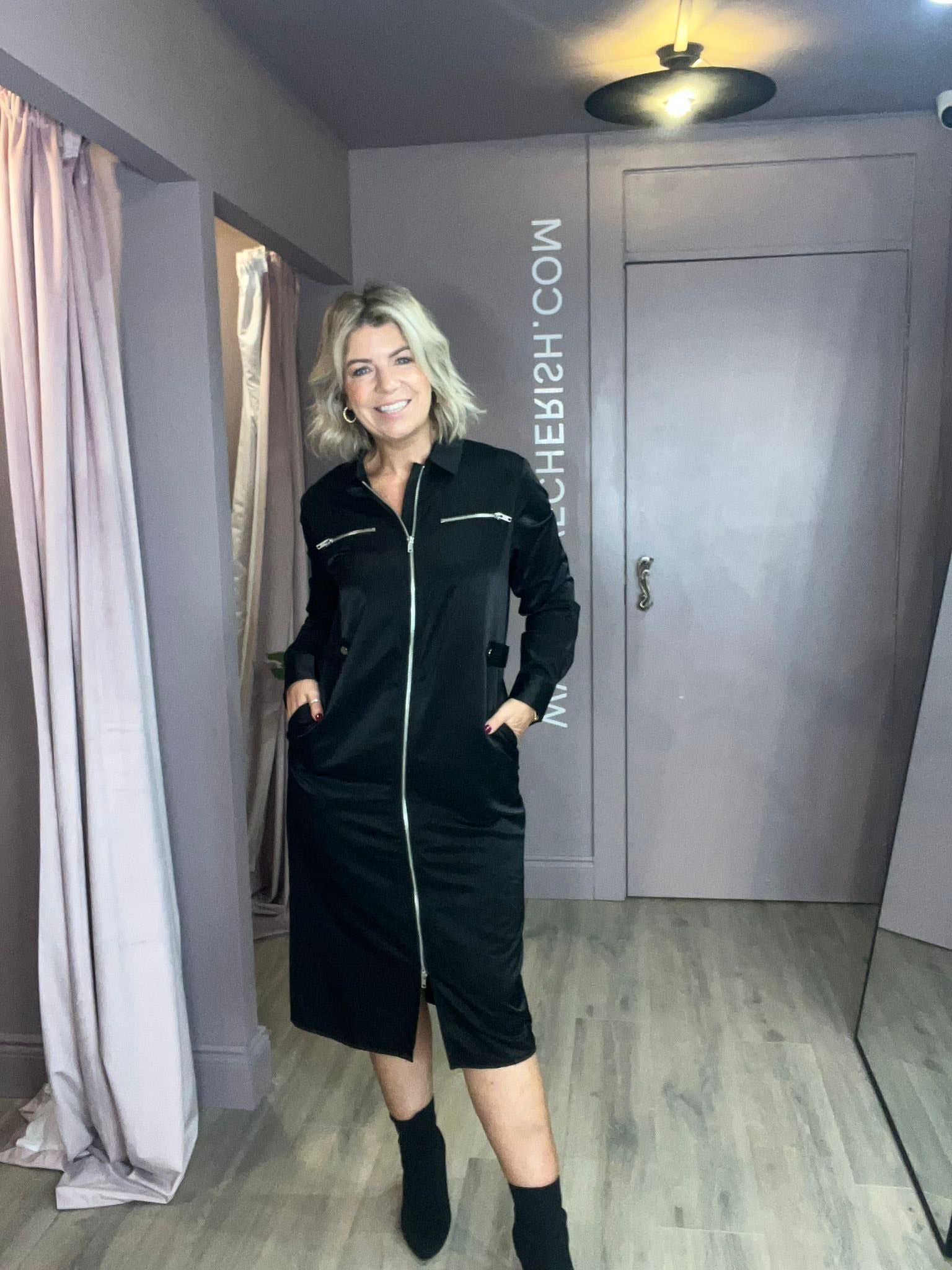 This chic dress features a shirt collar and long sleeves with a modern zip detail to complete an impeccable silhouette. Its regular fit will be sure to turn heads.