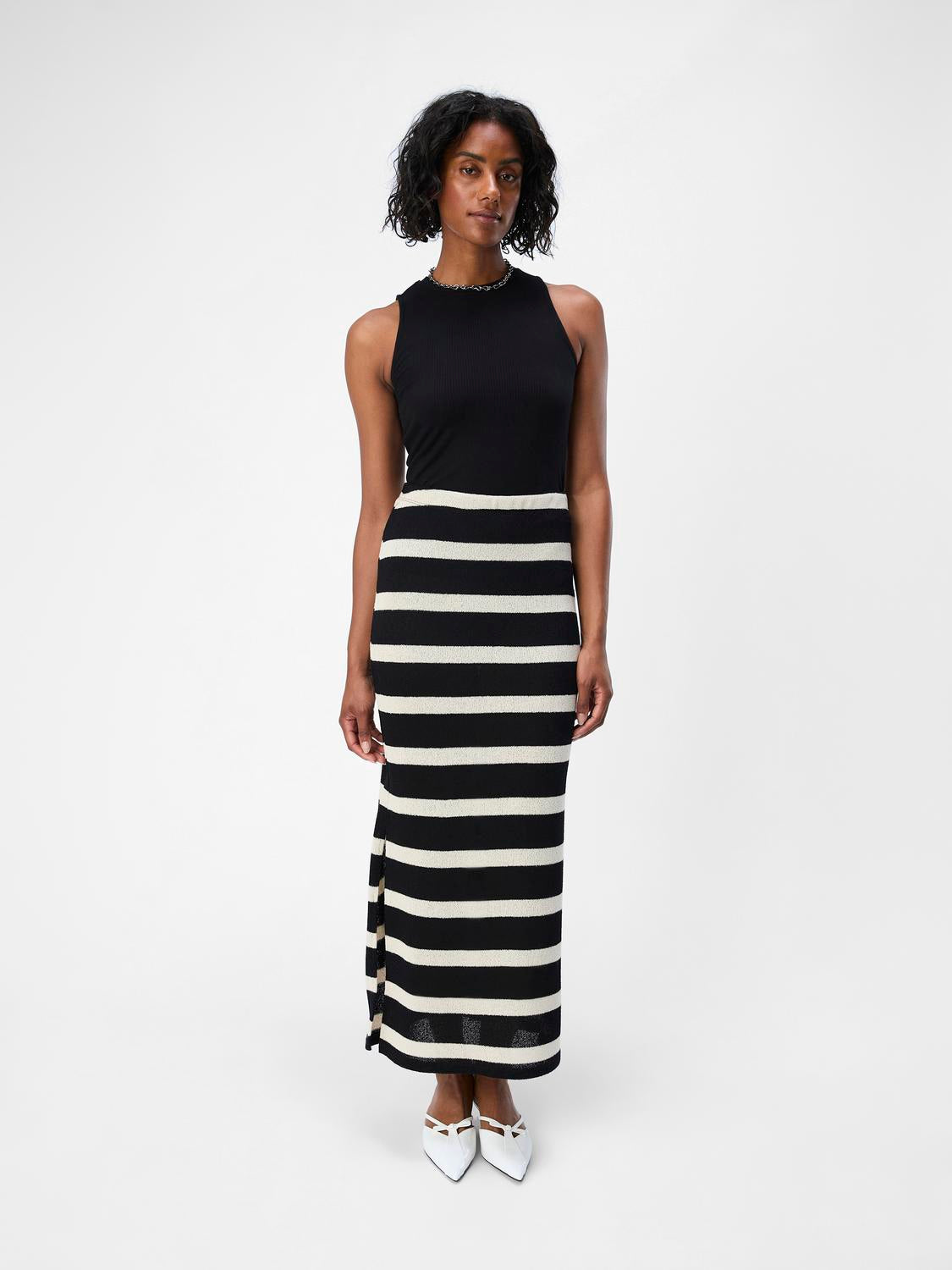 The Regina Long Skirt is a great addition to your Autumn/ Winter wardrobe with its strip detail and lovely soft fabric. It features an elastic waist, a slit on both side and lining to the knee.