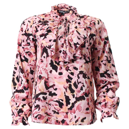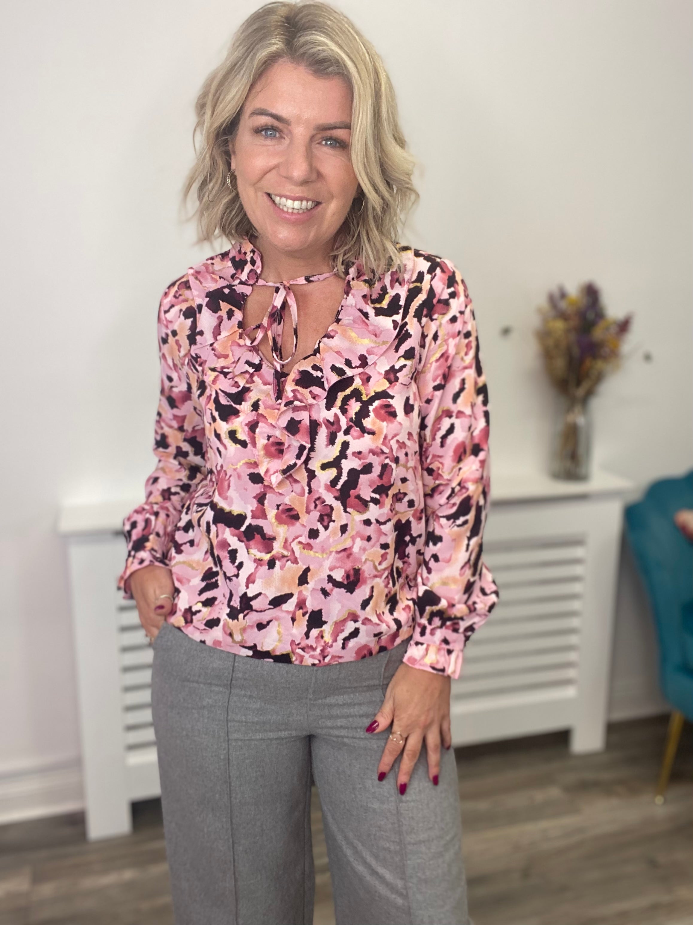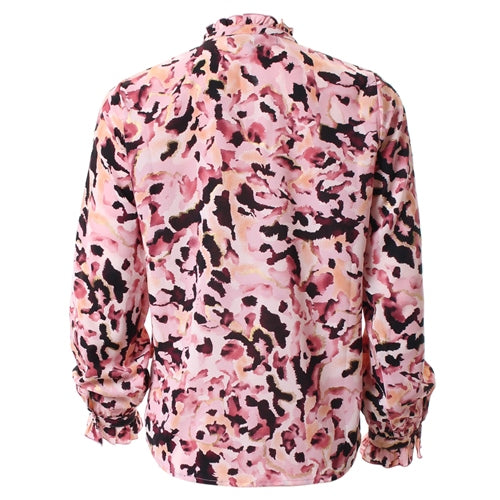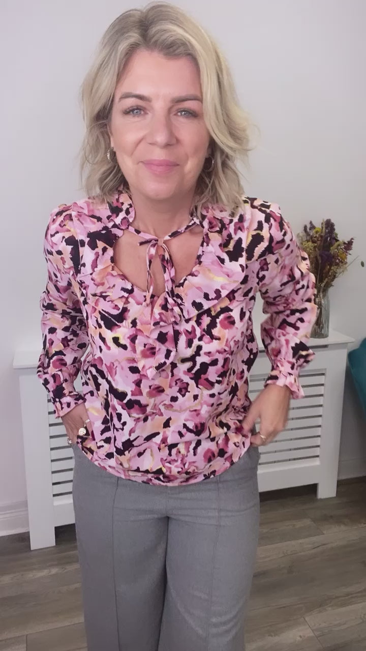 Printed all over with a bold animal pattern in deep wine and neutral tones, this blouse is designed in a relaxed silhouette with a gathered V neckline and exaggerated pintuck detailing along neck opening. Weve finished it with blouson sleeves and pleated buttoned cuffs. This blouse pairs perfectly with our tailored trousers - an effortless statement-maker.