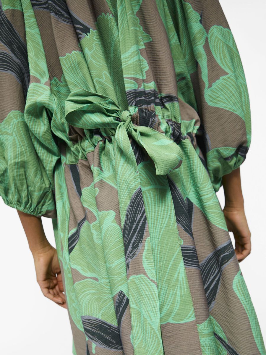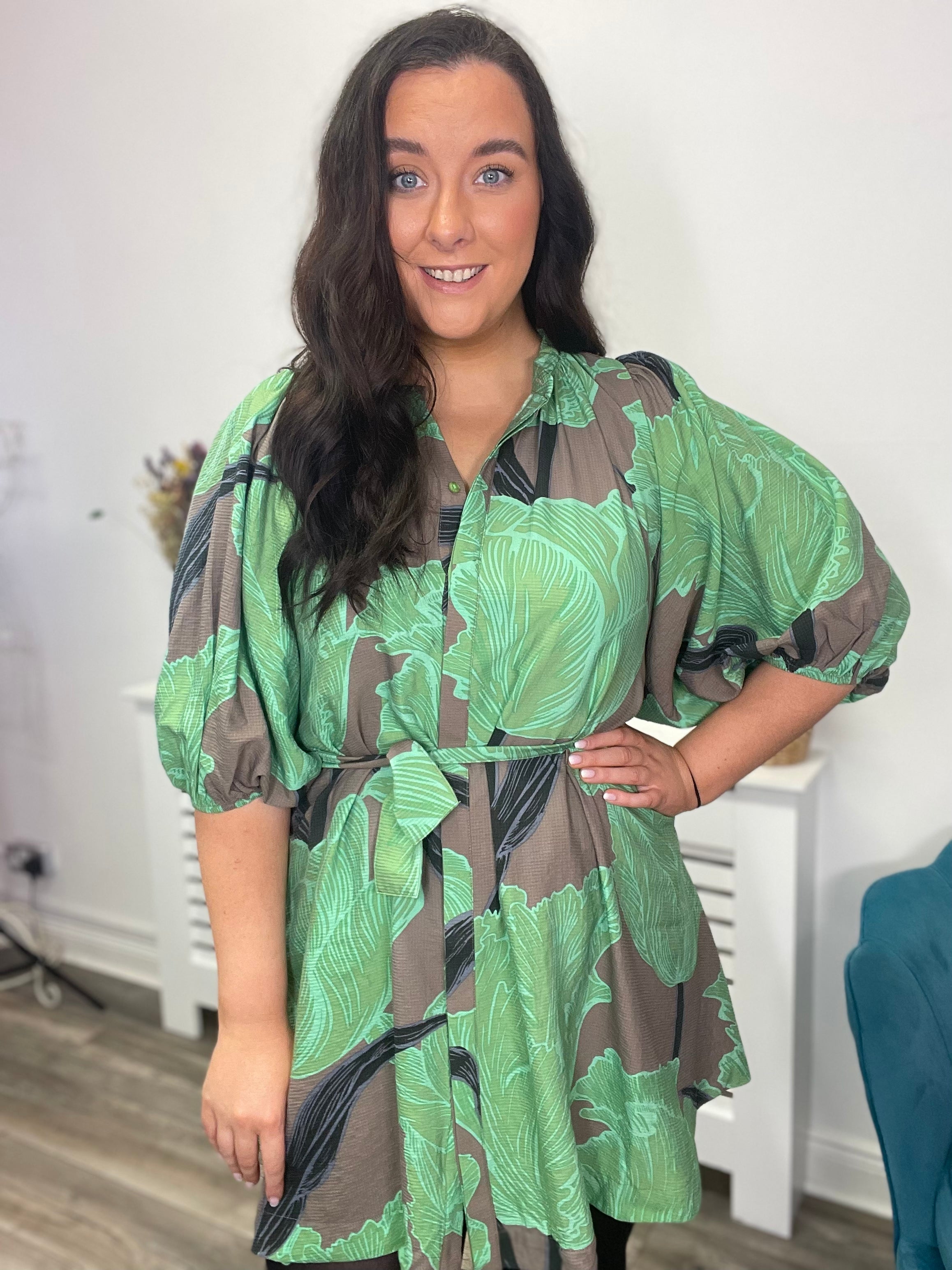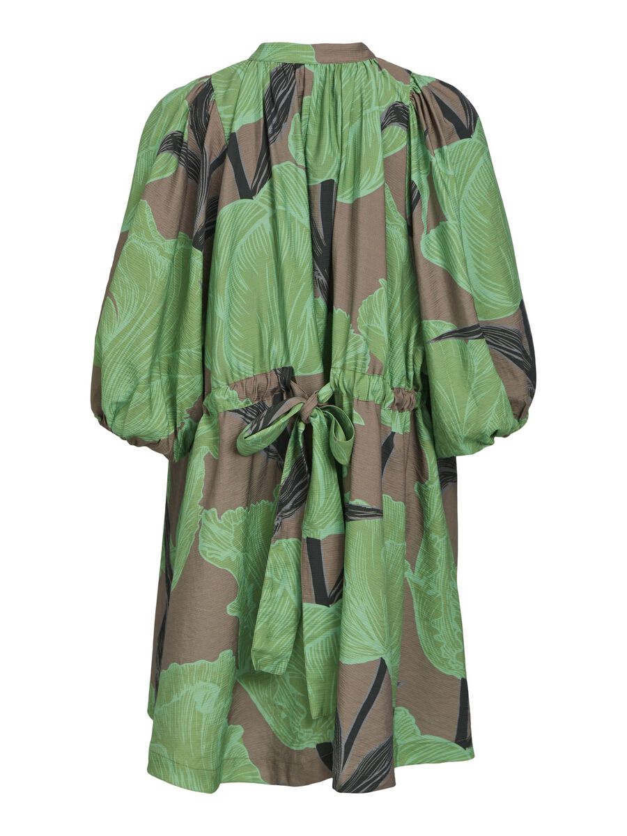 This printed mini shirt dress features a stand-away collar, 3/4 length balloon raglan sleeves with elasticated cuffs, bow fastening at the back, and a button-up front concealed by a placket. It has a loose fit, and is made with more sustainable fabrics.