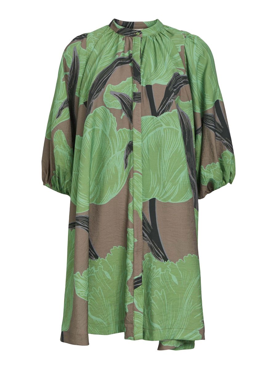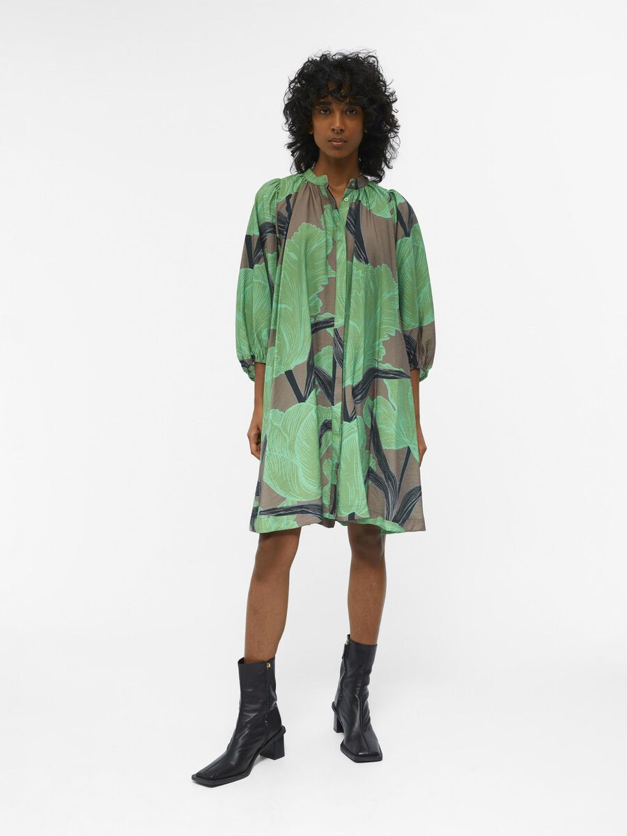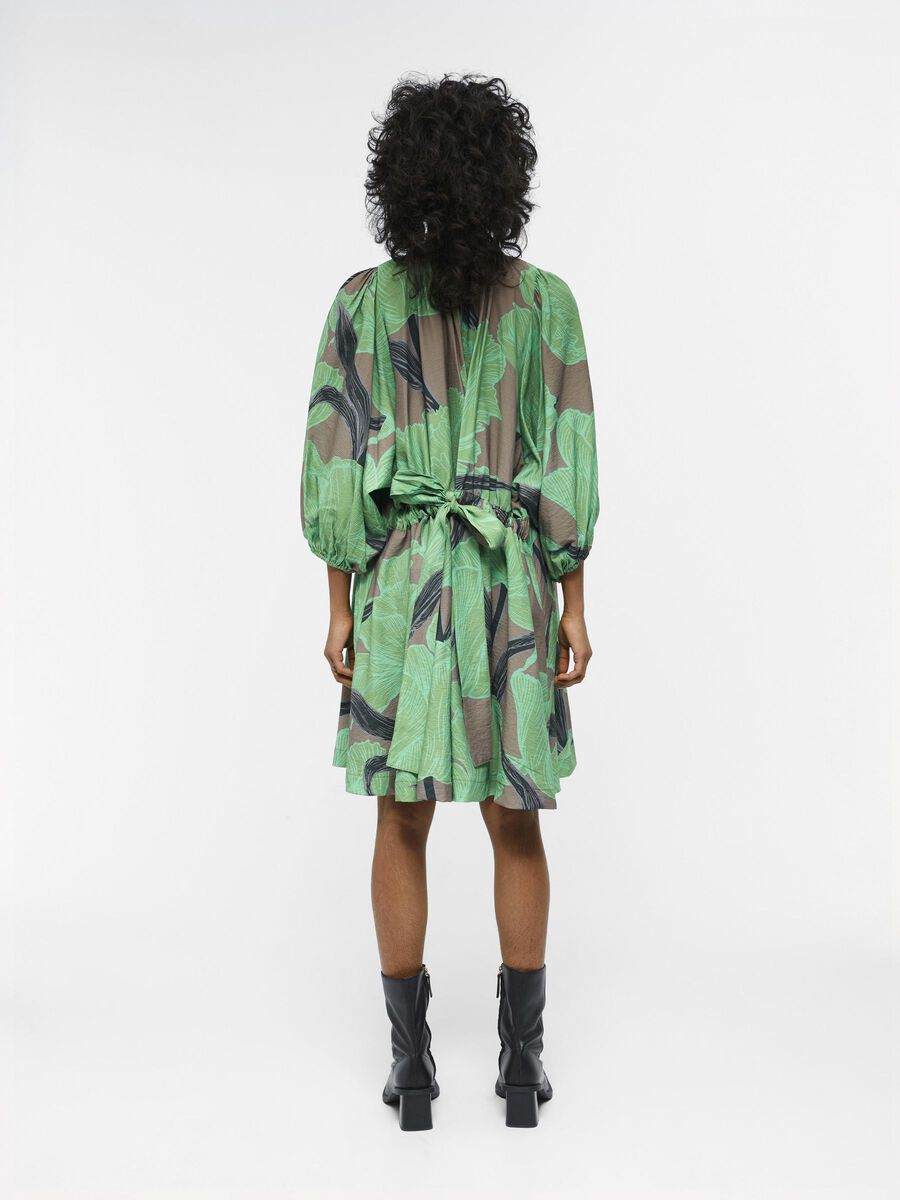 This printed mini shirt dress features a stand-away collar, 3/4 length balloon raglan sleeves with elasticated cuffs, bow fastening at the back, and a button-up front concealed by a placket. It has a loose fit, and is made with more sustainable fabrics.