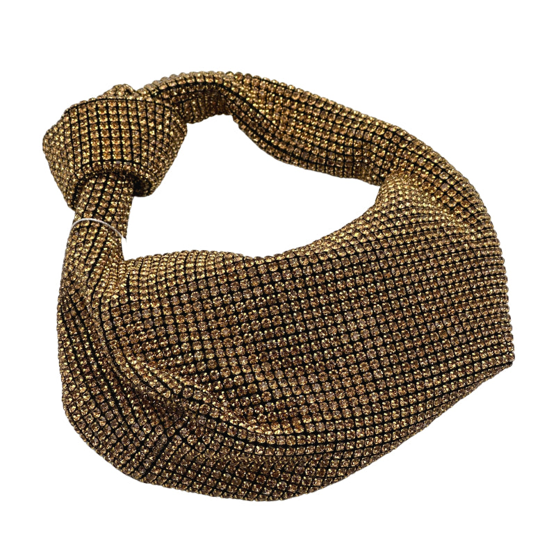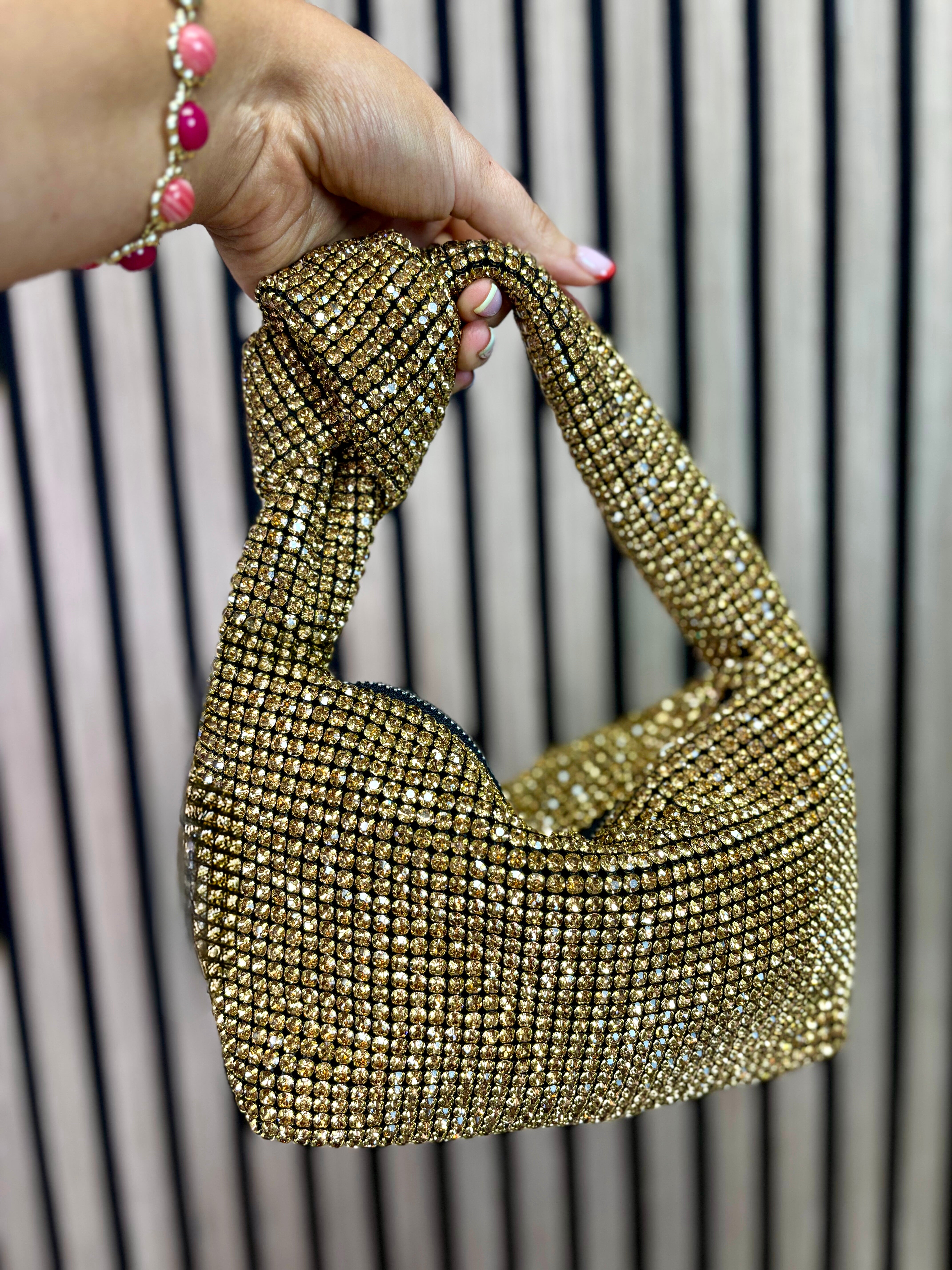 Add some sparkle to your look with the Romona rhinestone hand bag in gold. The shiny rhinestones and knotted handle give it a unique touch, while the inner zipped pocket and fully lined interior provide practicality. Zip it up and take on the day in style!