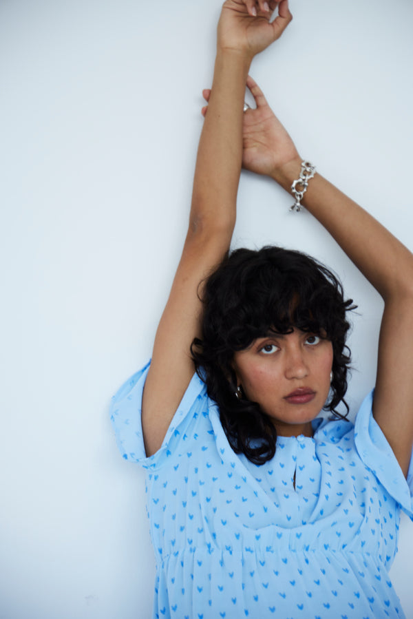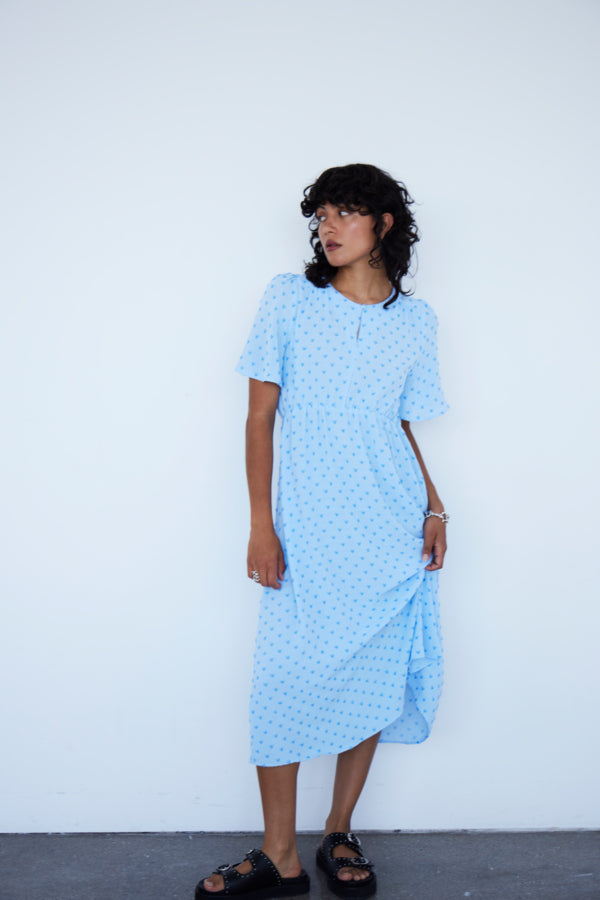 The SABEL dress boasts a charming heart pattern and a modern cut-out neck detail with a single button closure. The midi length and elastic waist create a comfortable fit, making it perfect for any occasion. Expertly designed with short sleeves, this dress is a versatile and stylish addition to your wardrobe.