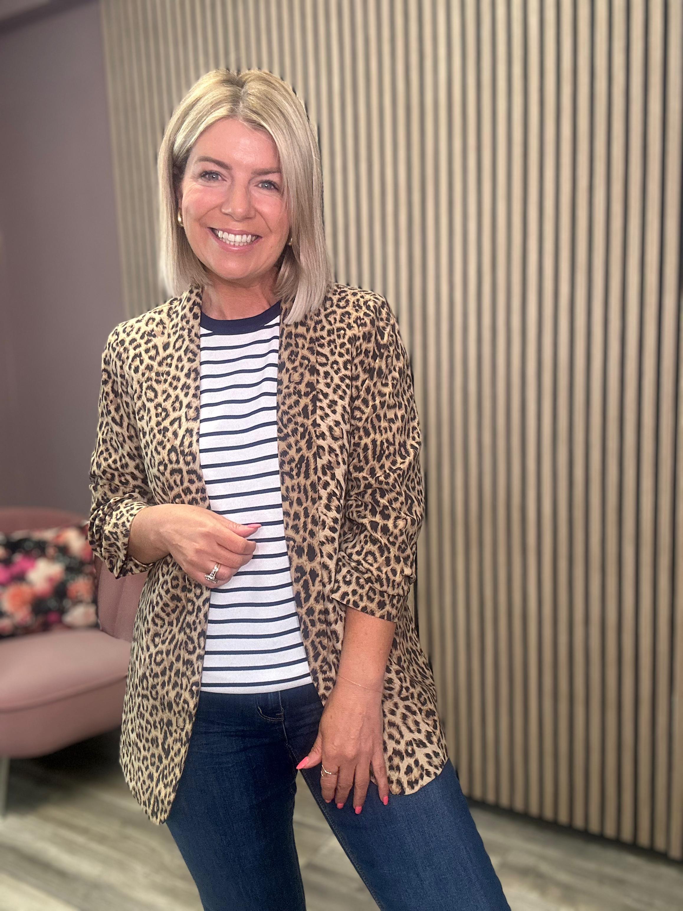 Quirky and fun, this Sella blazer features shawl lapels and an open front, as well as 3/4 length sleeves with gathered cuffs. The playful leopard print will add a touch of wildness to your wardrobe, and the multiple design options ensure you'll stand out amongst the herd. Lined for comfort and style, this jacket is a must-have for those who love to play with fashion.
