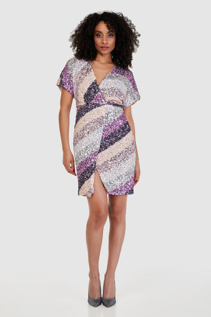 Turn heads in this striking striped sequin Kimono Dress. It’s fully lined in a soft satin and has a wrap front.