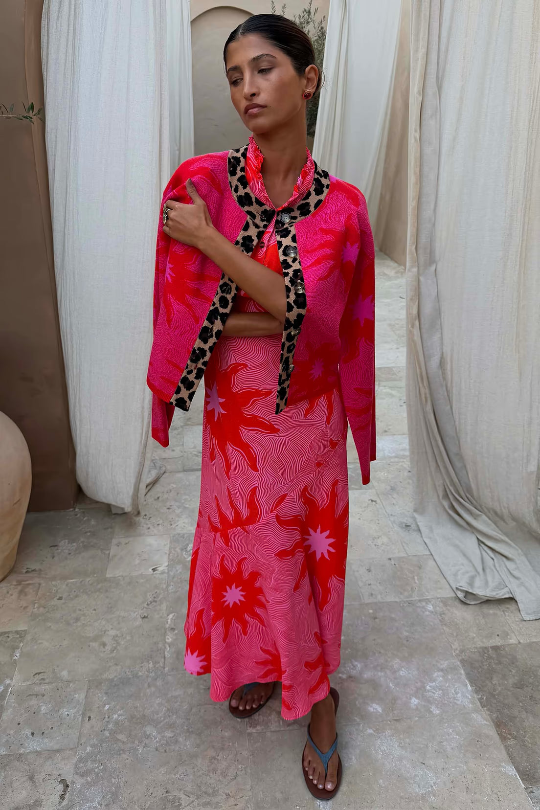 The weighty, soft touch knit fabric makes this cardigan feel so luxe and premium, a bright and bold pink base in the new Soleil print by Never Fully Dressed. The stunning line detailing in the print feels so chic, with the red sun motifs elevating the look even further. With wide sleeves for a slightly oversized, boxy look and leopard print along the neckline and button stand adding an extra touch of NFD flair, pair this cardi with some barrel jeans or thrown over a skirt for a classic day to night outfit.