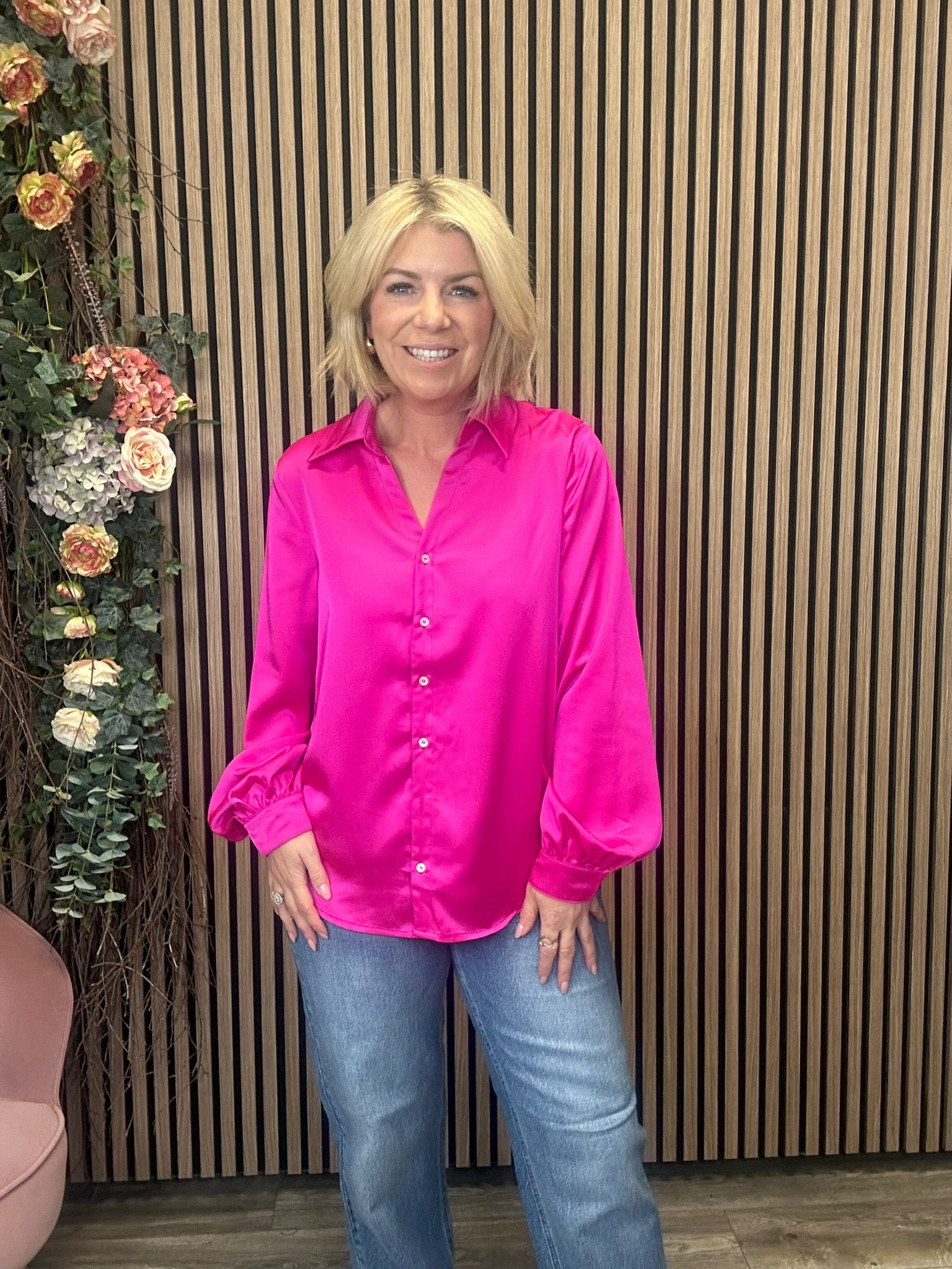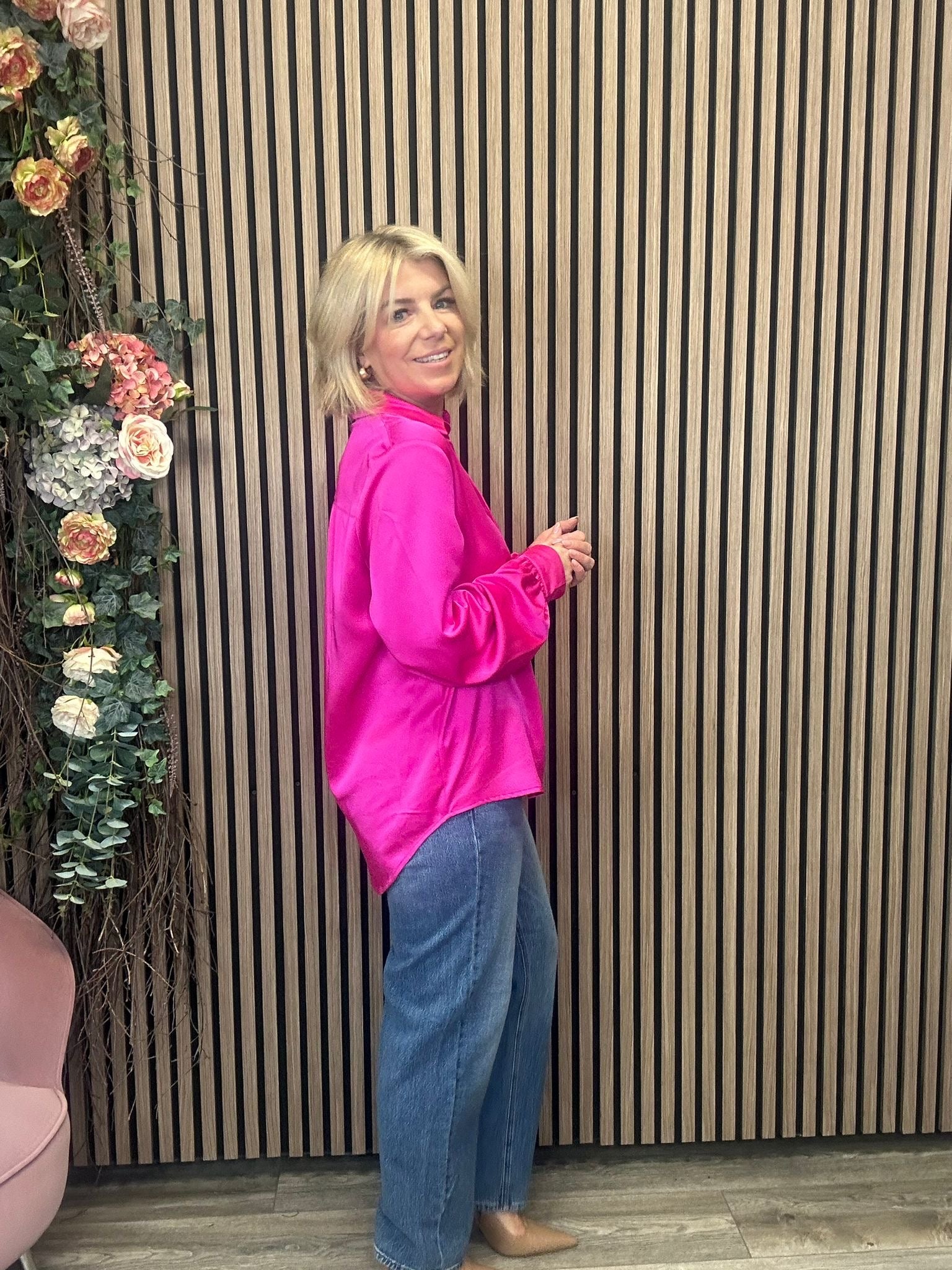 The Sophia shirt is a button-up shirt with a beautiful pink satin texture. Whether worn casually for everyday use or dressed up for a night out, its relaxed oversized fit makes it a versatile style.