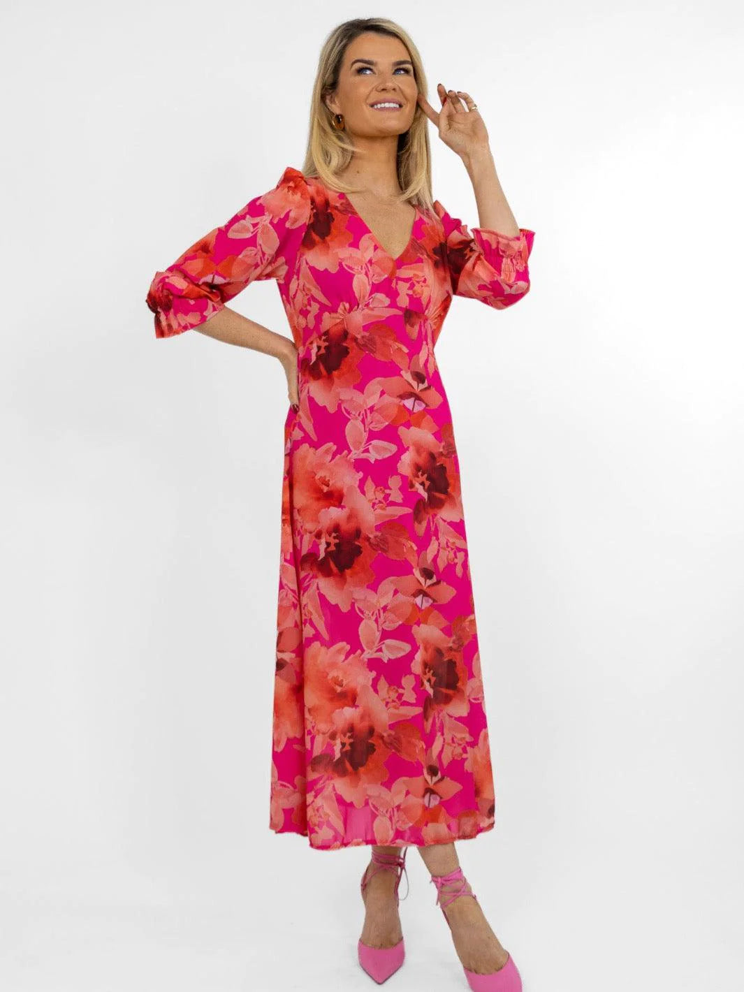 Crafted with a beautiful pink floral print, the STREASA dress features a flattering V-neck and3/4 length sleeves with elasticated cuffs. Its empire waistline is also elasticated at the back for a comfortable fit. With a midi length skirt, this dress is perfect for any occasion.