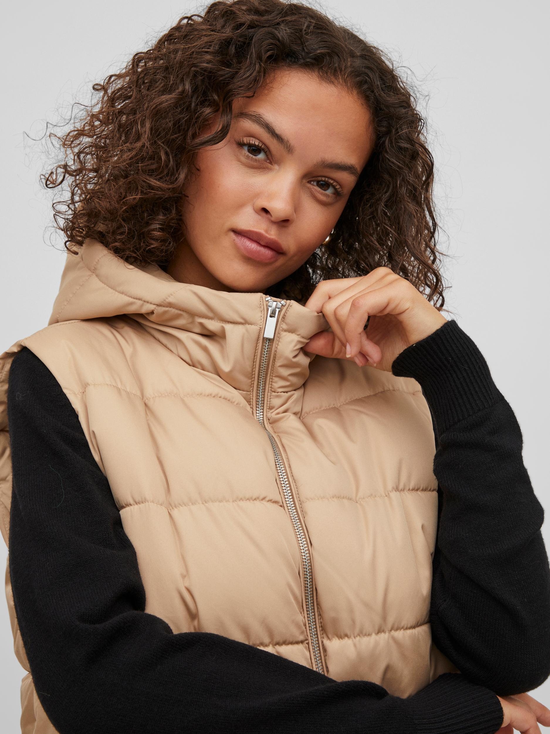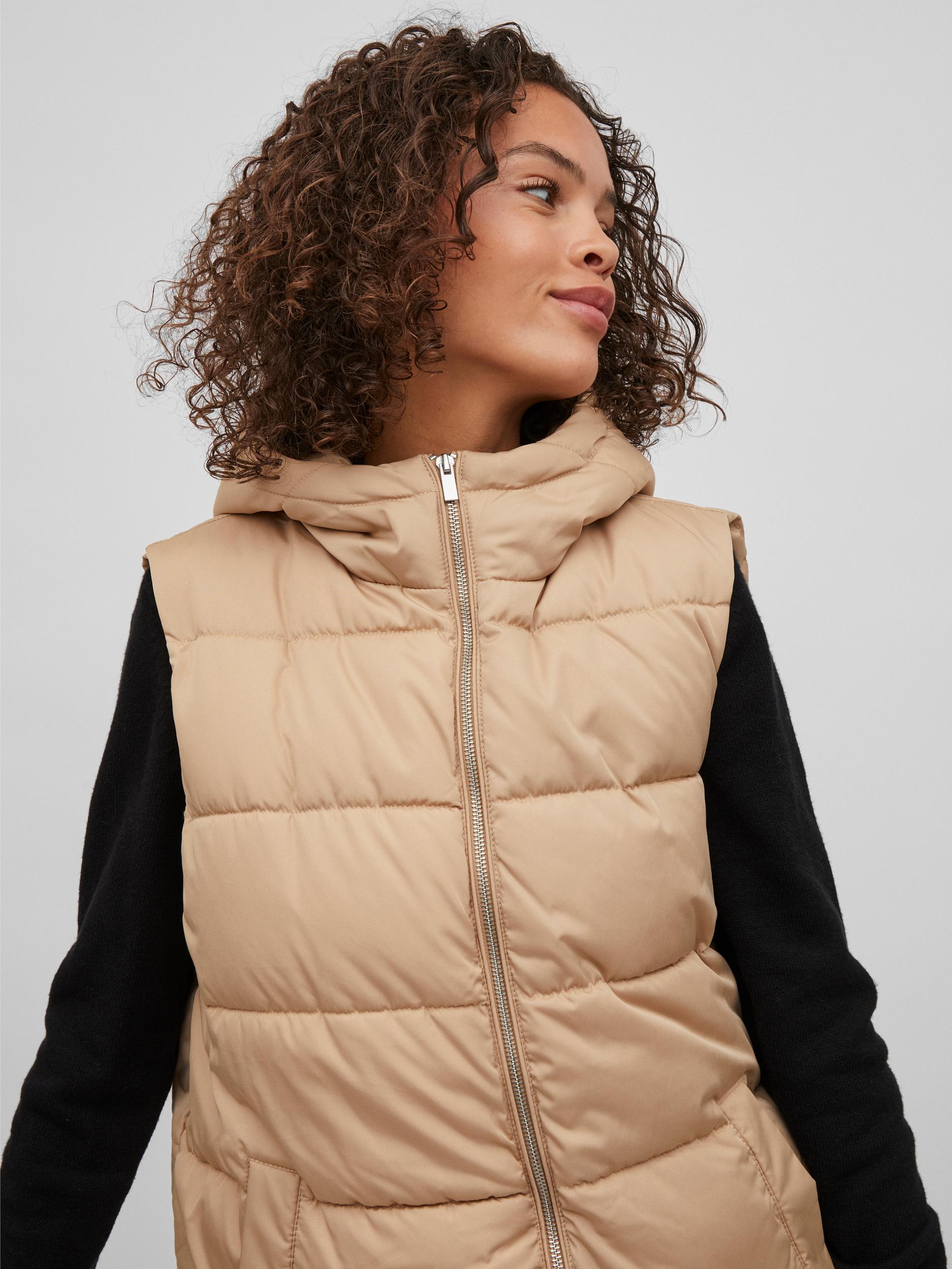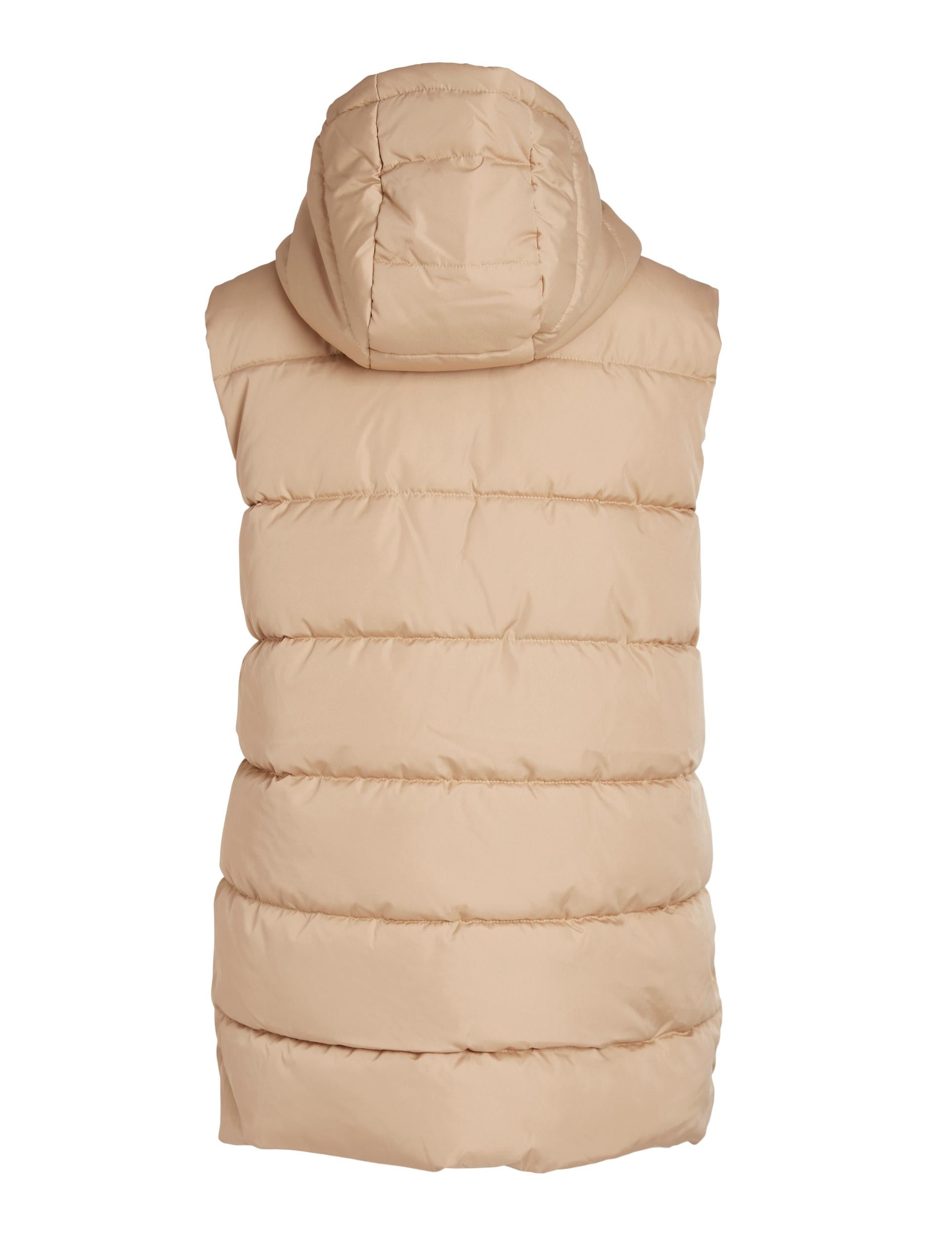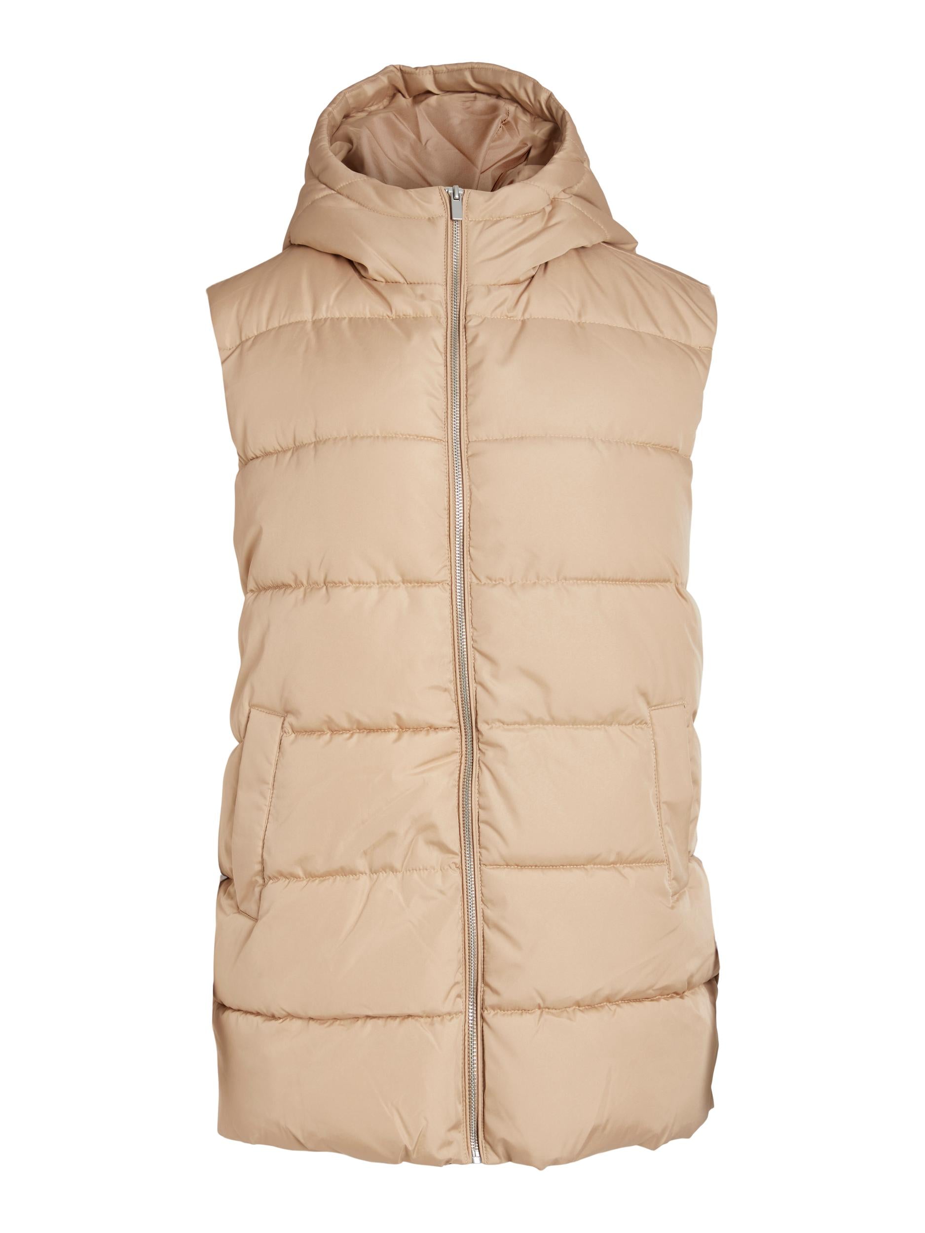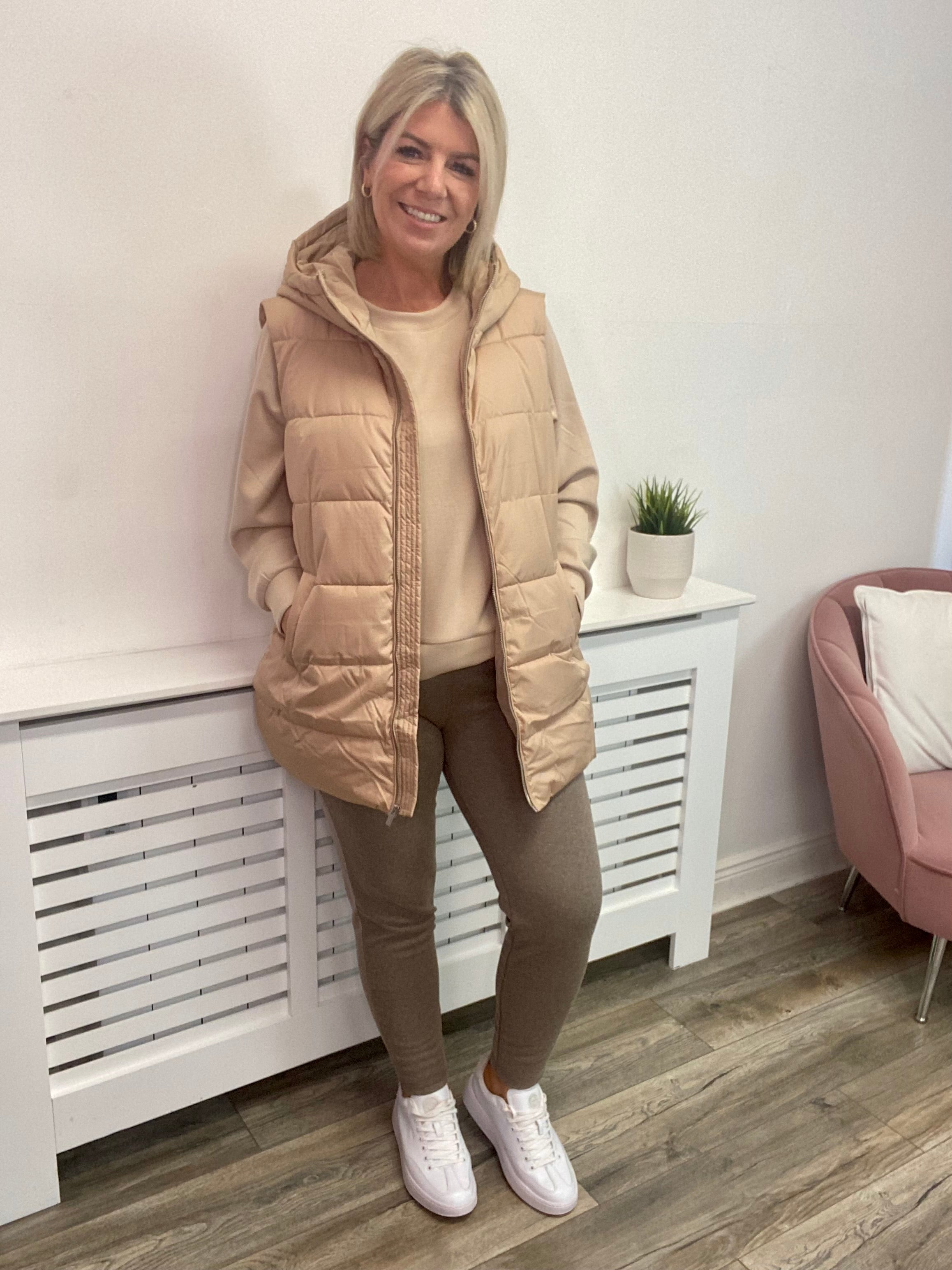 This TATE Sleeveless Gilet is a stylish and practical choice for chilly weather. The beige gilet has a hood, is sleeveless and made from padded material for extra warmth. It features two pockets, a full length zip and falls below the hip for added comfort.