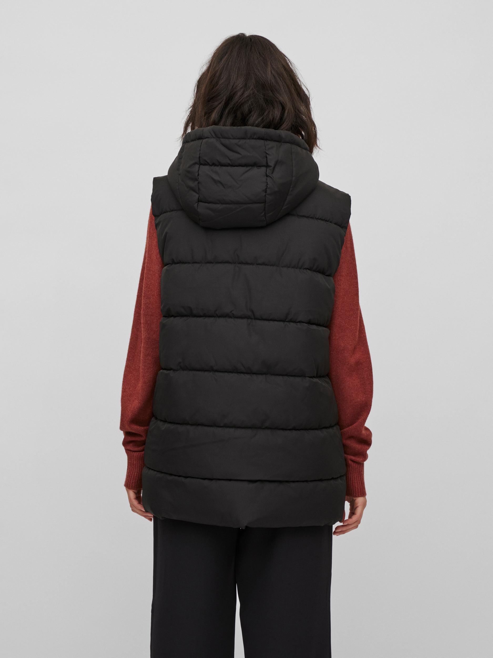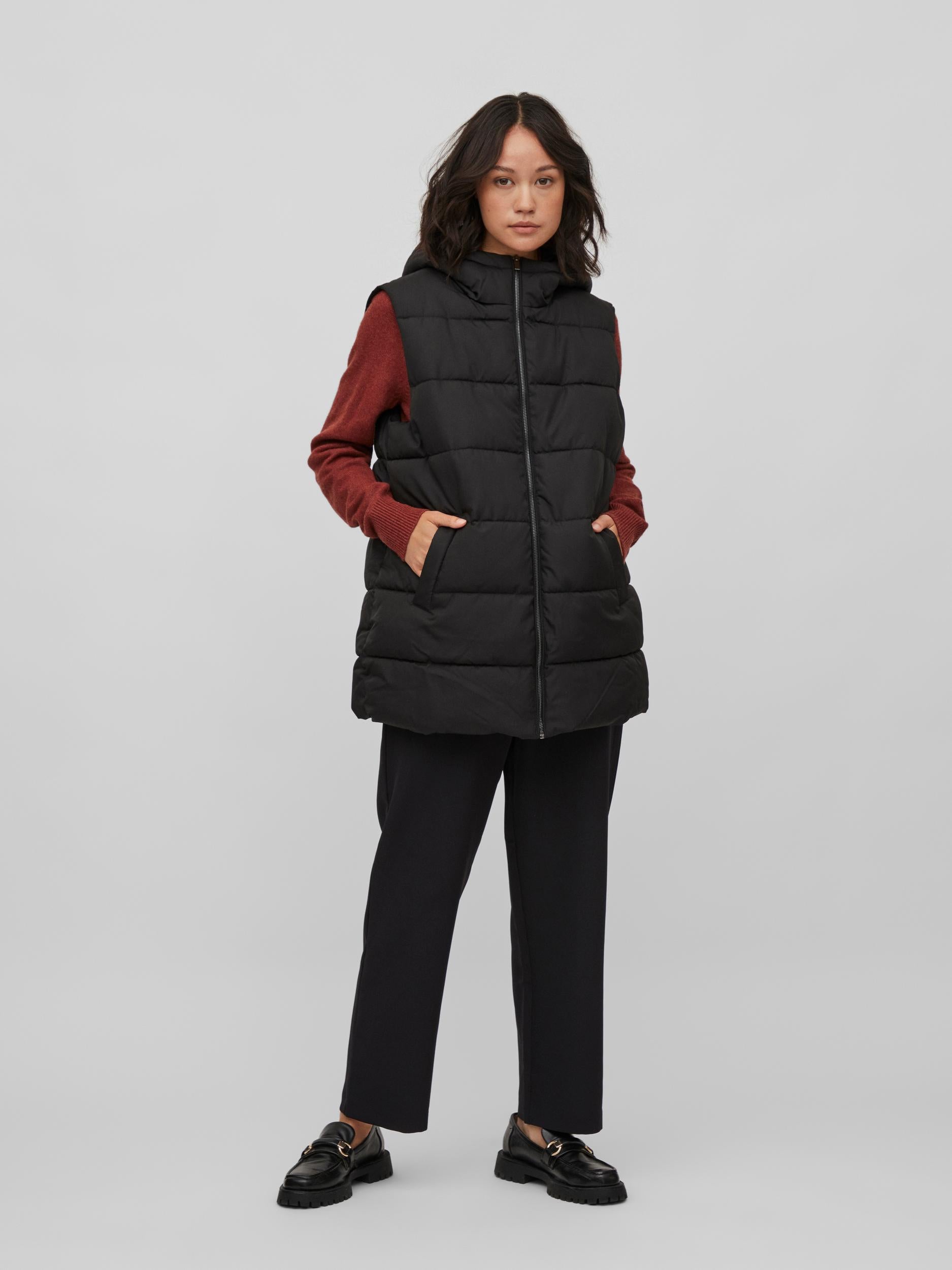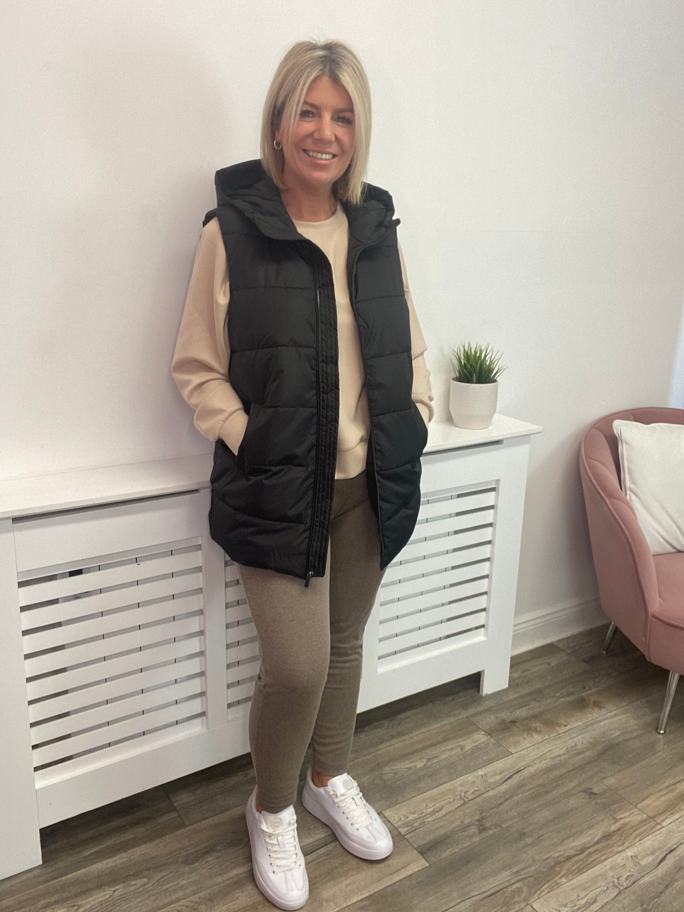 This TATE Sleeveless Gilet is a stylish and practical choice for chilly weather. The black gilet has a hood, is sleeveless and made from padded material for extra warmth. It features two pockets, a full length zip and falls below the hip for added comfort.