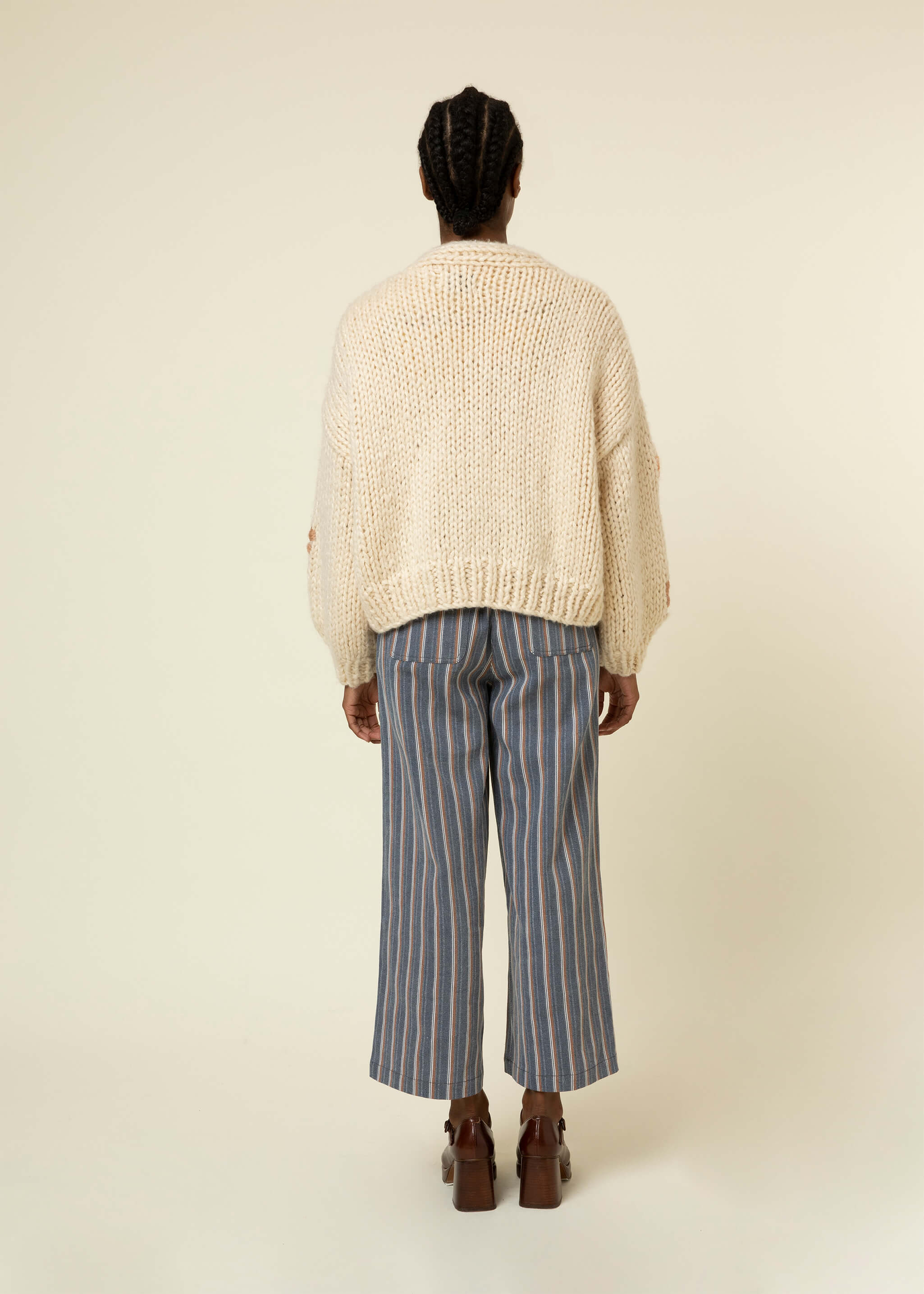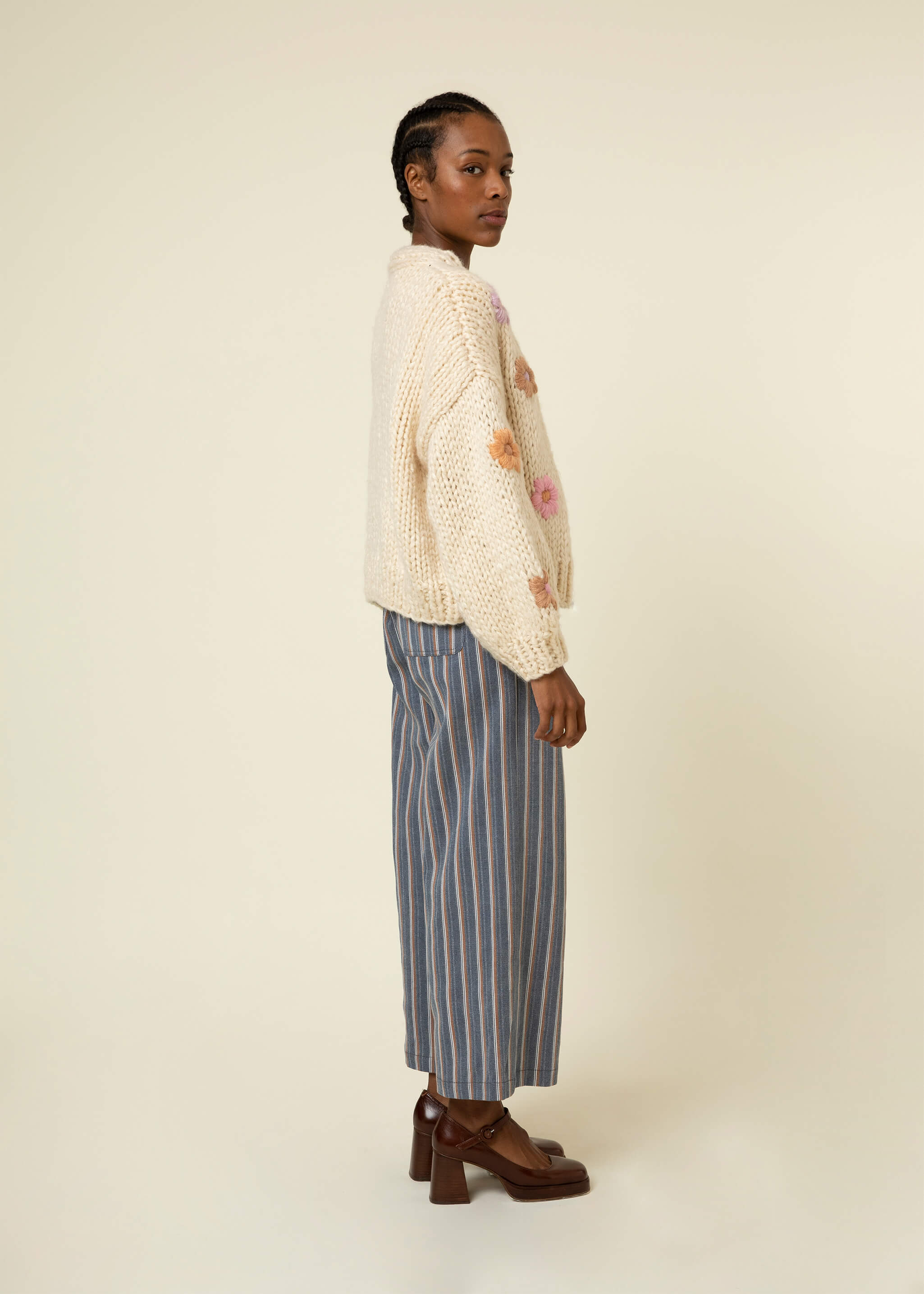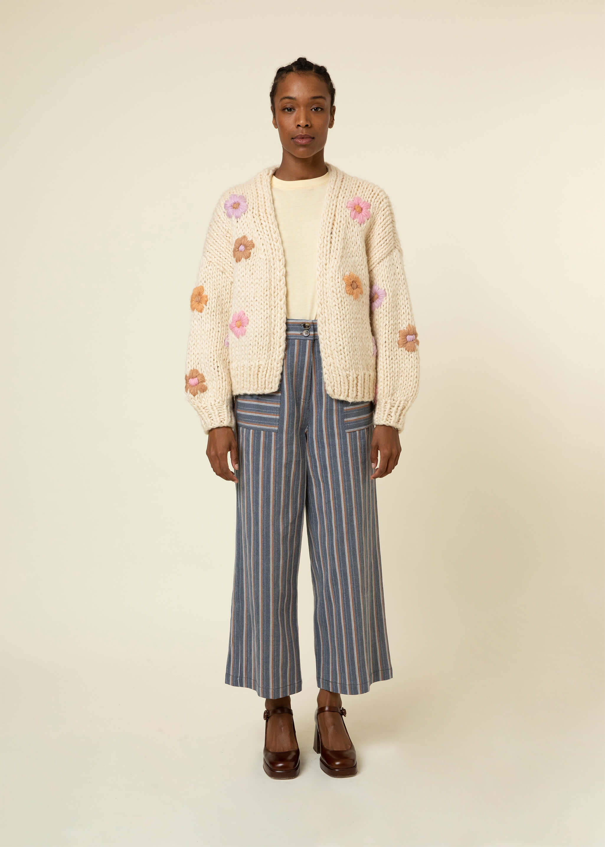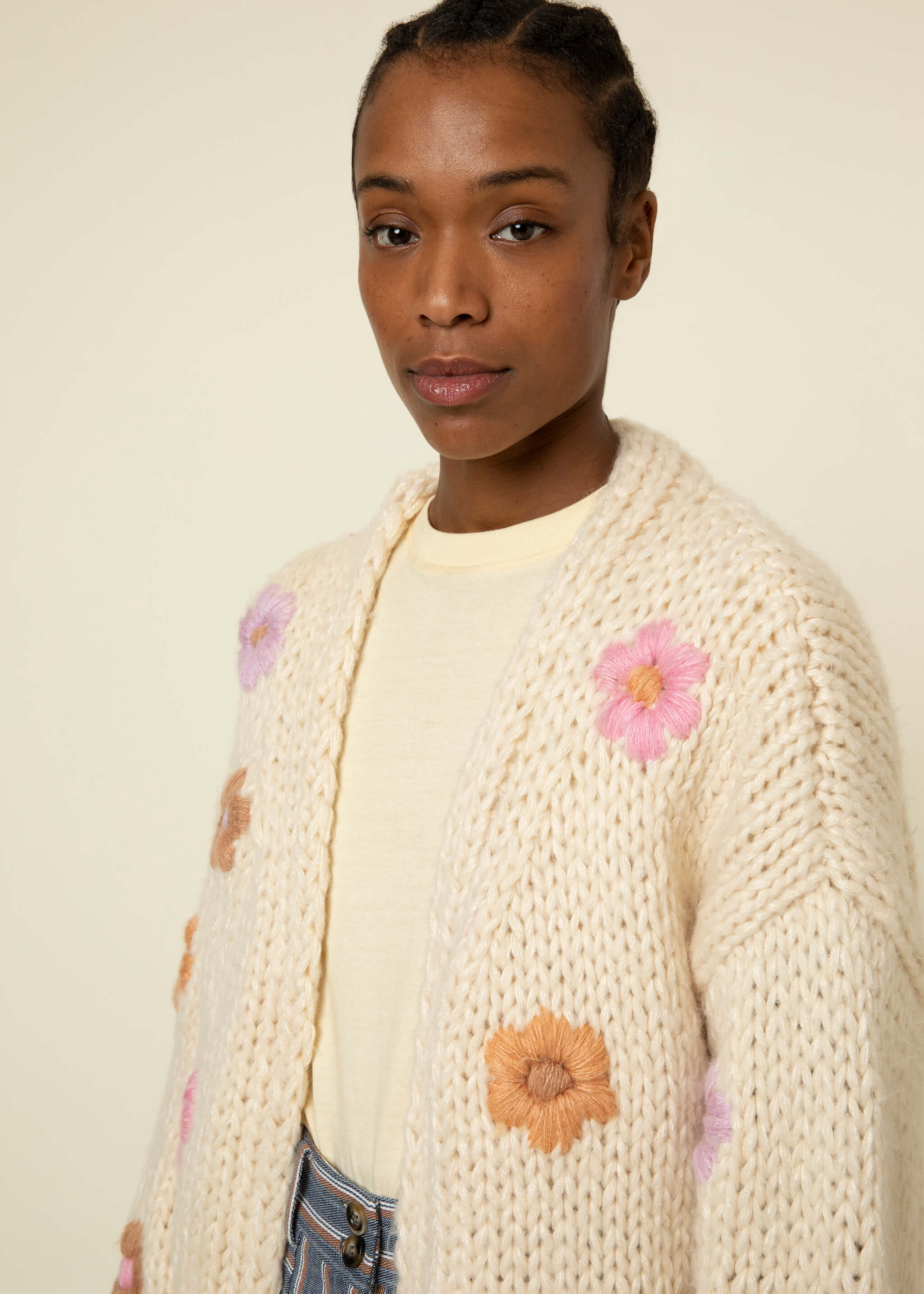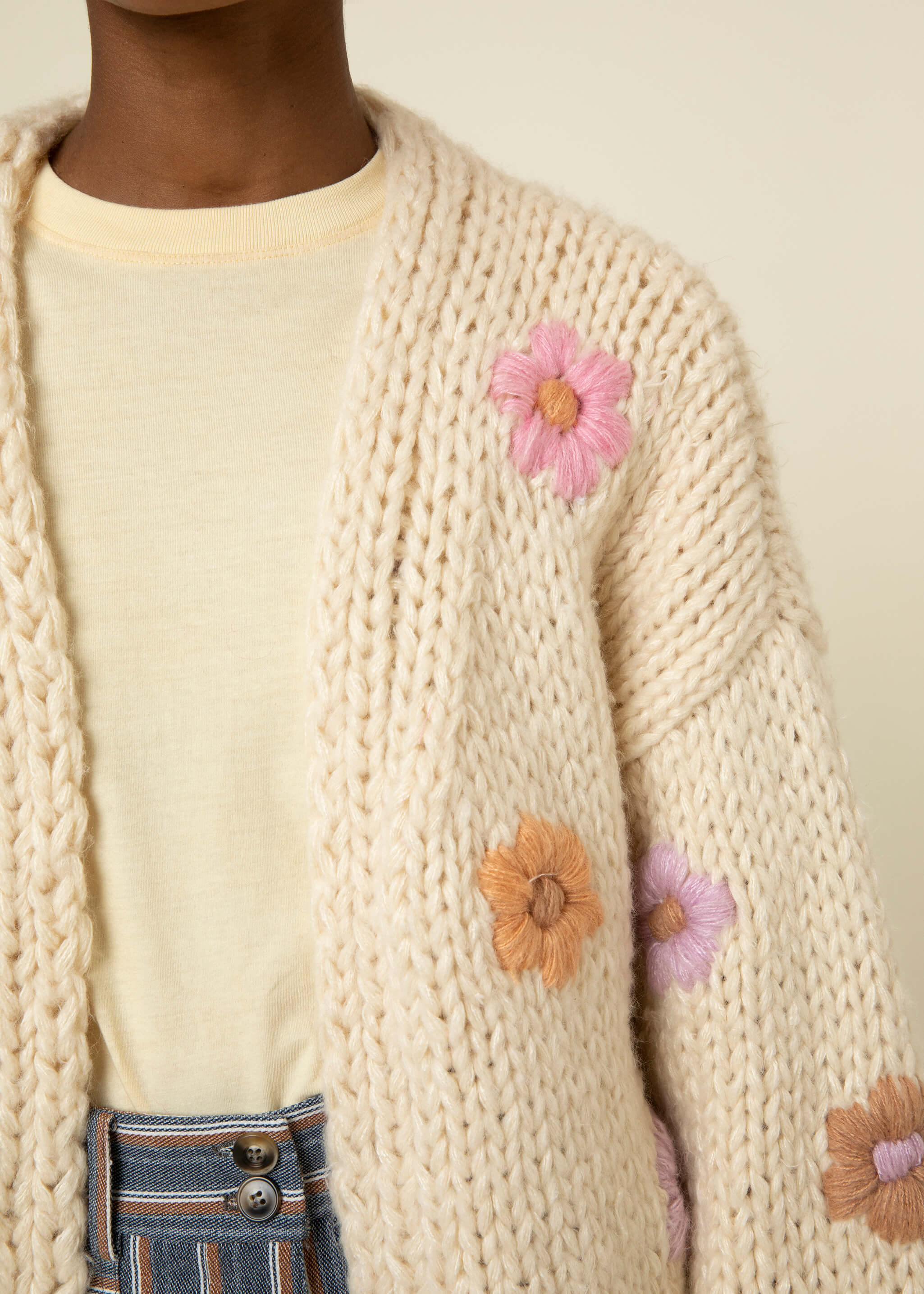 Taya charms and delights with beautiful embroidered flowers on a classic cream knit. Designed for a loose fit, her chunky knit is soft and cosy. Style with a simple tee and jeans for an easy go-to outfit.