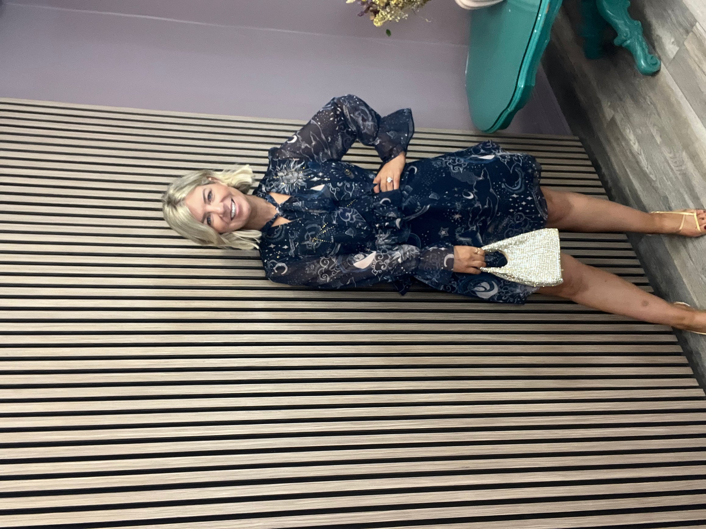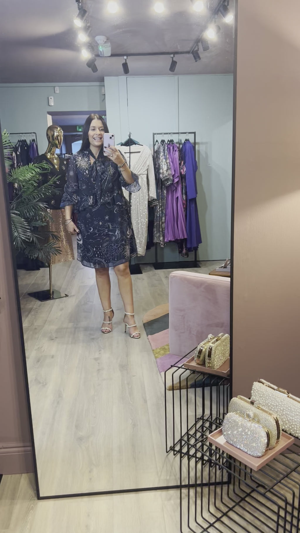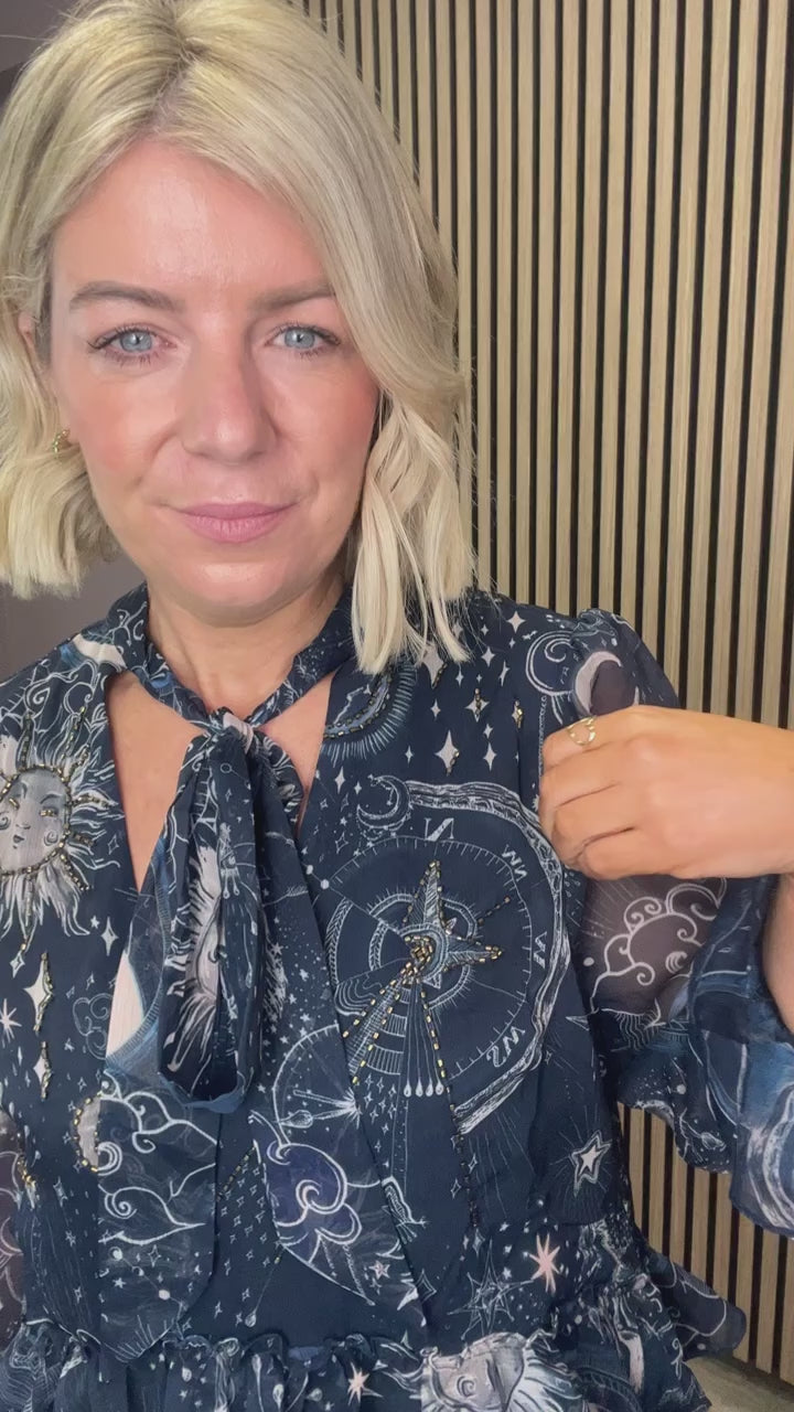 Enchant and entrance onlookers in the gorgeous ALIDA Mini Dress from Hope & Ivy. Hand designed gold celestial print covers the deep navy base, further elevated by gold beaded embellishment. With a tie neckline and ruffled skirt and sleeves, add this to your autumn wardrobe to feel event-ready and fabulous.