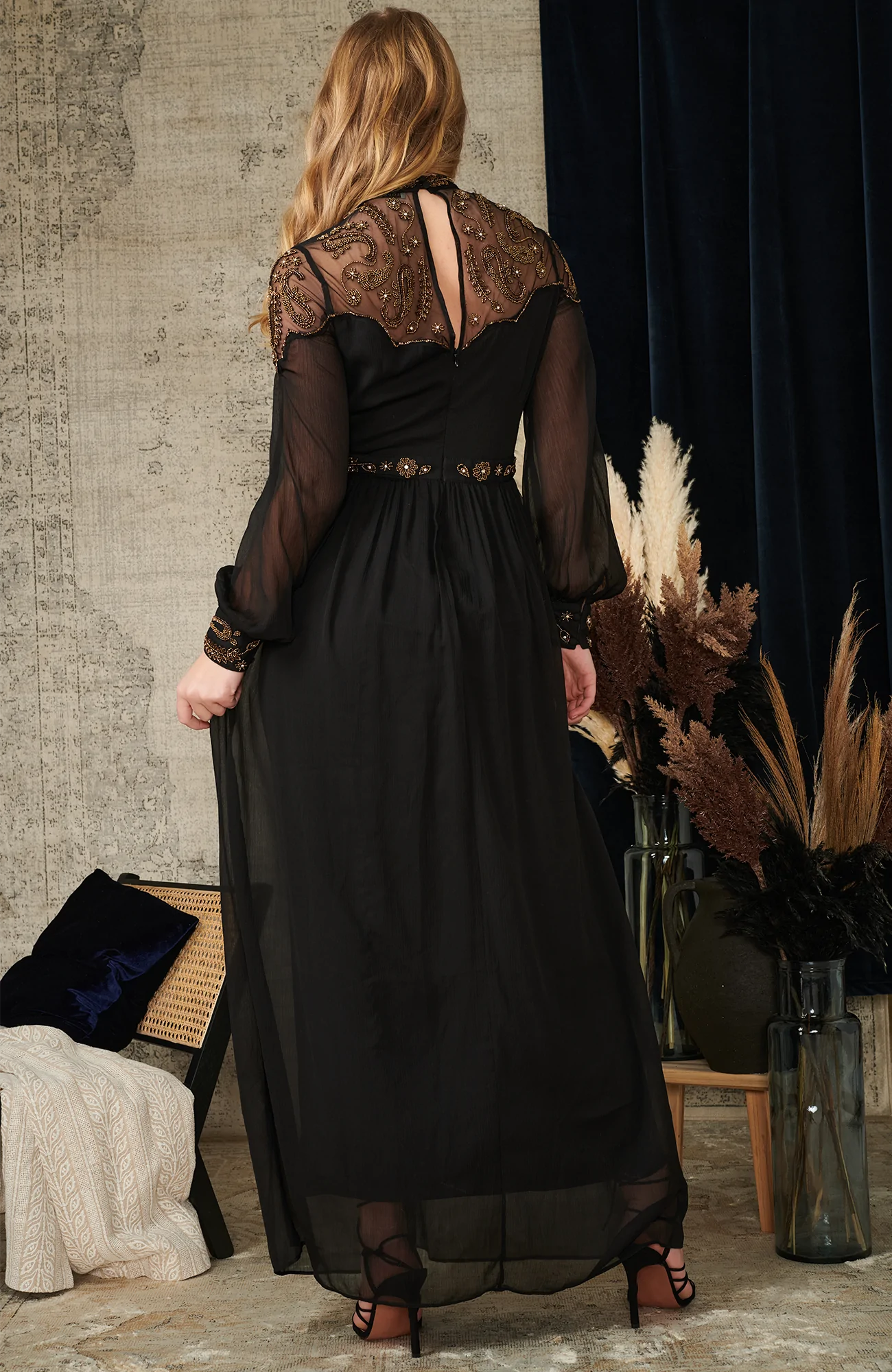 This celestial style is a real head turner from our Hope & Ivy Winter 22 collection. The black base is beautifully adorned with a hand-finished gold embellishments on the bust, shoulders, waist and sleeves. Featuring a high neckline and blouson sleeve, the maxi skirt flows down to finish as ankle length. Striking yet sophisticated, this timeless piece will become a much-loved classic in your autumn wardrobe.