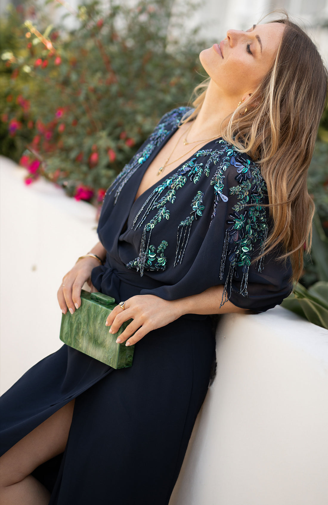 Enchant and enthral in this exquisite Hope & Ivy design from our Autumn Winter 23 collection. Expect this gorgeous navy number to see you through every occasion this Autumn. The fabulous wrap style with tie waist is undeniably flattering. With emerald green embellishments and beaded fringe detail, radiate resplendence and add a touch of sparkle to your Autumn.