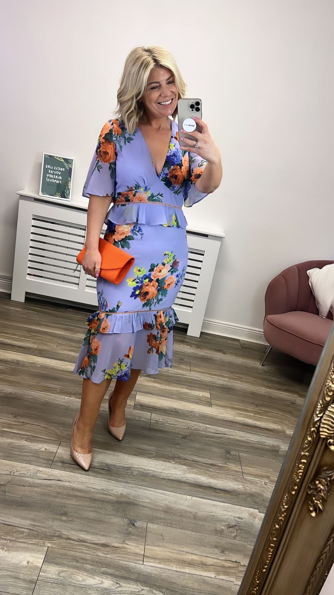 Amorous and alluring, this striking Hope & Ivy style is a must-have for your Spring 23 wardrobe. Colour pop orange and yellow botanicals are strewn over the lilac base in stand-out hues. The v-neckline and peplum waist create a striking silhouette, completed with a tiered ruffle skirt that finishes at mid-calf length and contrast lace trims. This versatile piece can be styled up or down for any occasion. Whatever you’re doing, you’re guaranteed to charm and enchant in this transitional Spring piece.
