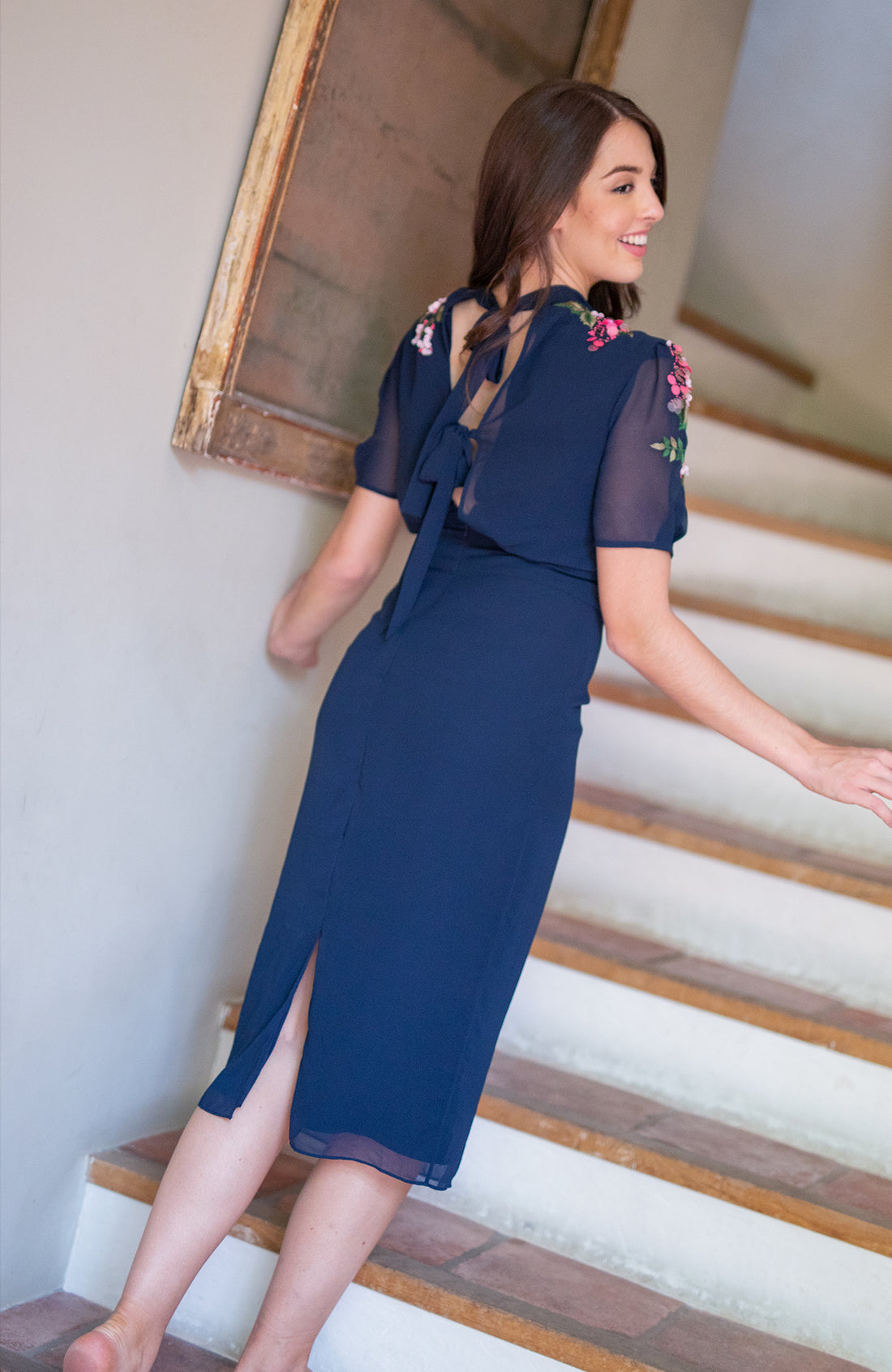 Enchant and enthral in this exquisite Hope & Ivy design. Expect the chic CIARA navy midi dress to see you through every occasion this spring. The figure-skimming pencil silhouette with self-tie back detail and blouson sleeves are undeniably flattering. With pretty, pink, 3D embellishments and contrasting green embroidery motifs beautifully adorning the bodice and sleeves, radiate resplendence and add a touch of sparkle to your spring.
