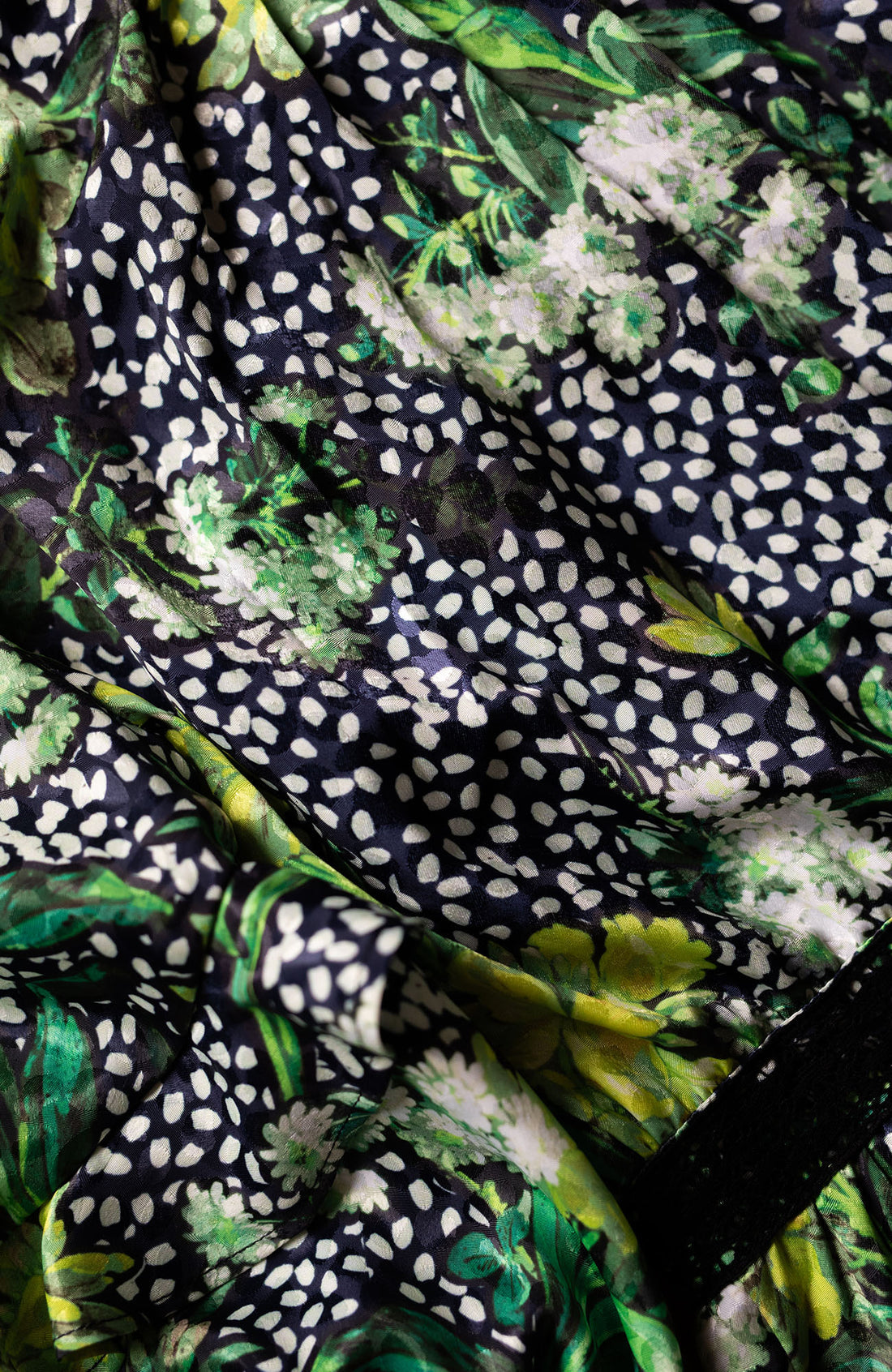 This gorgeous style is classic Hope & Ivy from our Autumn Winter 23 collection. Featuring vibrant green florals on a white and black spot base of soft satin. With tiered skirt, lace inserts and frilled blouson sleeves, this style is set to be a must-have staple. Add this to your collection of classics, to win hearts and turn heads this Autumn.