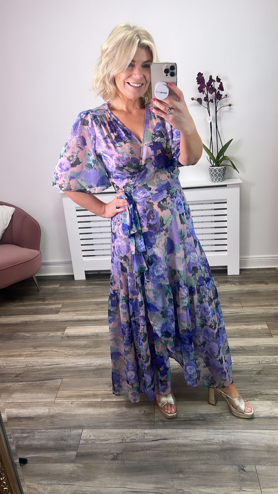 Signature silhouette and Hope & Ivy print handwriting is at its best in this coveted classic from our Spring 23 collection. Lilac and green florals bloom on the soft blush pink base. With a heritage wrap front and tie waist, this flattering shape is completed with full flutter sleeves and a drop hem skirt that finishes at floor length. Perfect for an intimate garden party or a sunny getaway, the Eira is set to be a sought-after style this Spring.