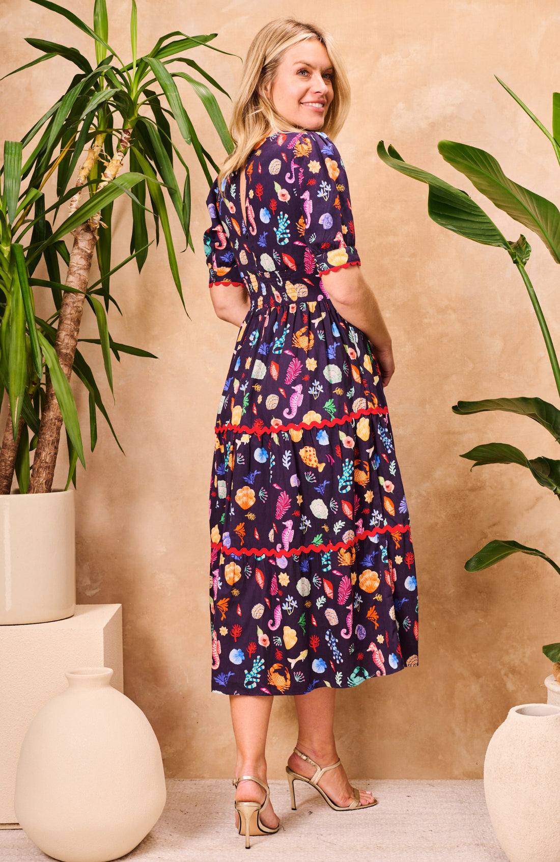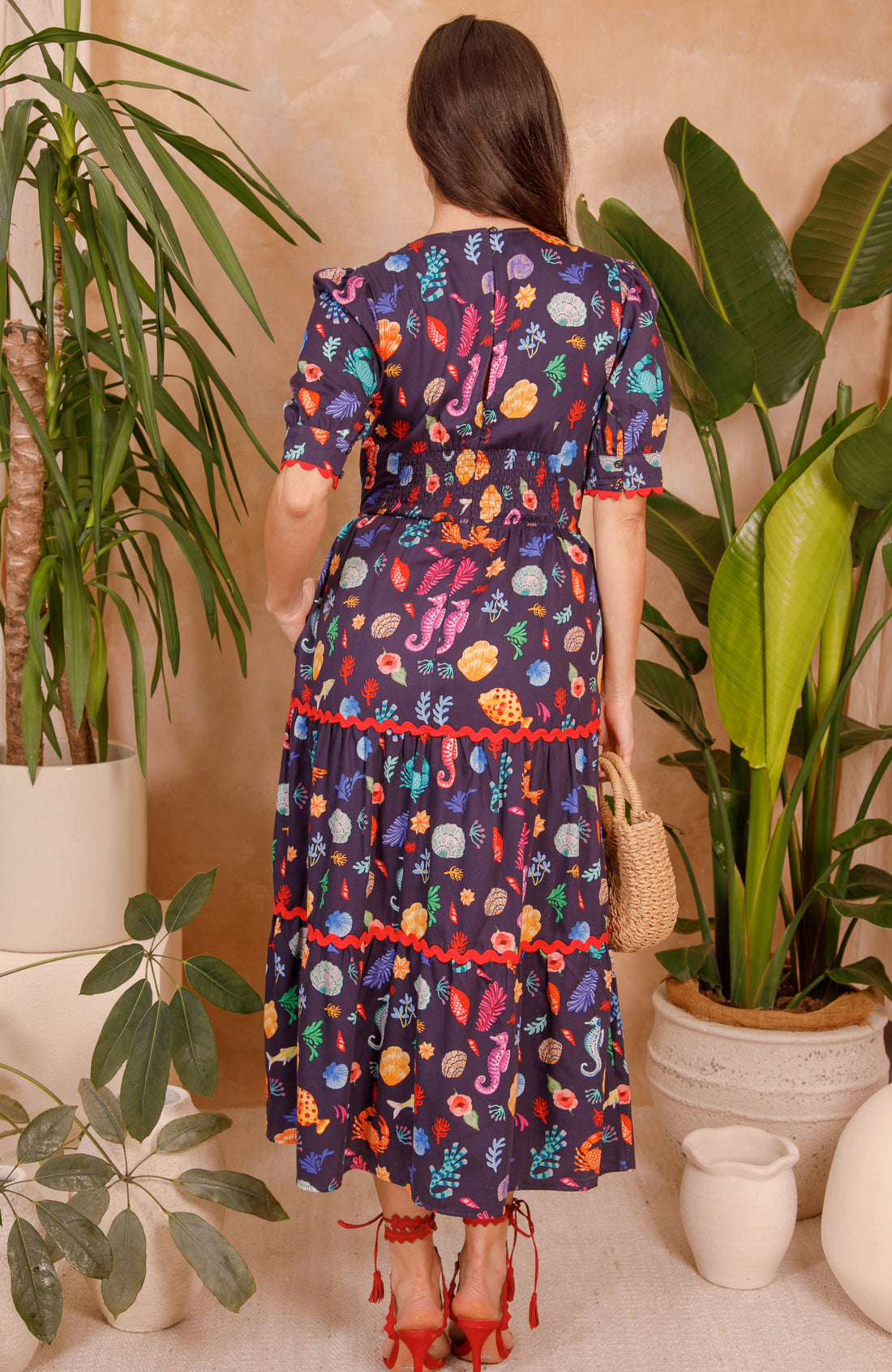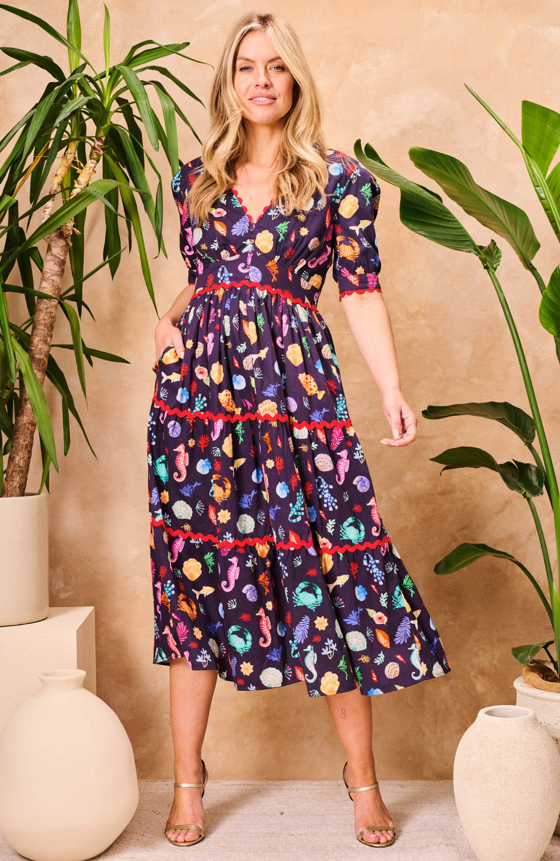 A feminine full-skirted tea dress is perfect for beachside picnics, summer parties and all sorts of seasonal soirées. With a charming, hand-designed print featuring underwater creatives, the 100% cotton Laurel is cut with a flattering V-neck and complete with puff sleeves and a banded skirt. We love the little details, including the rickrack trim and flexible shirred back.