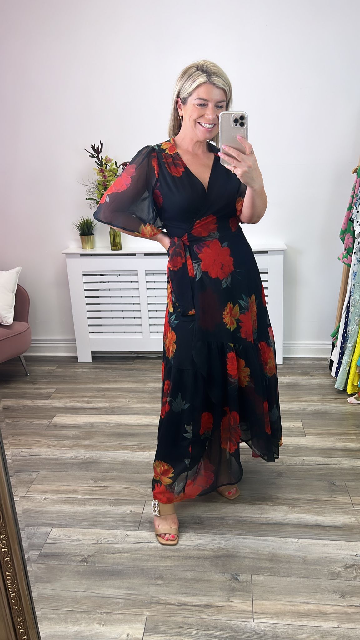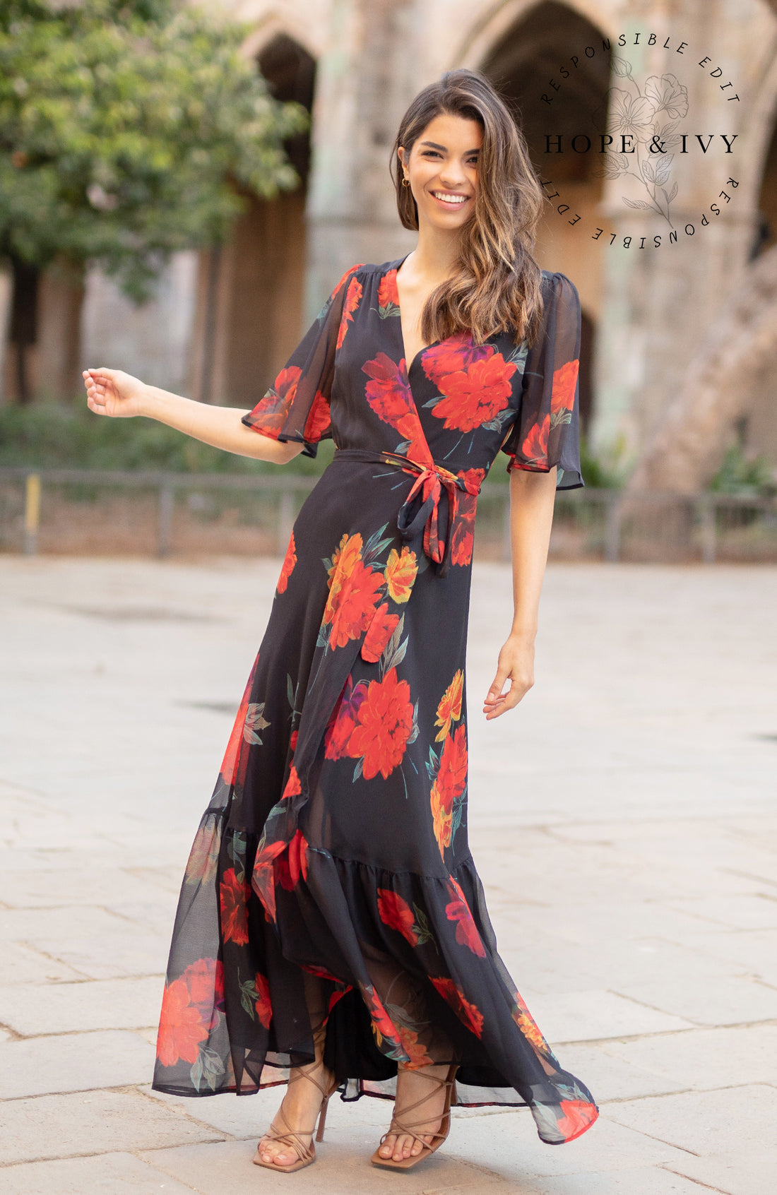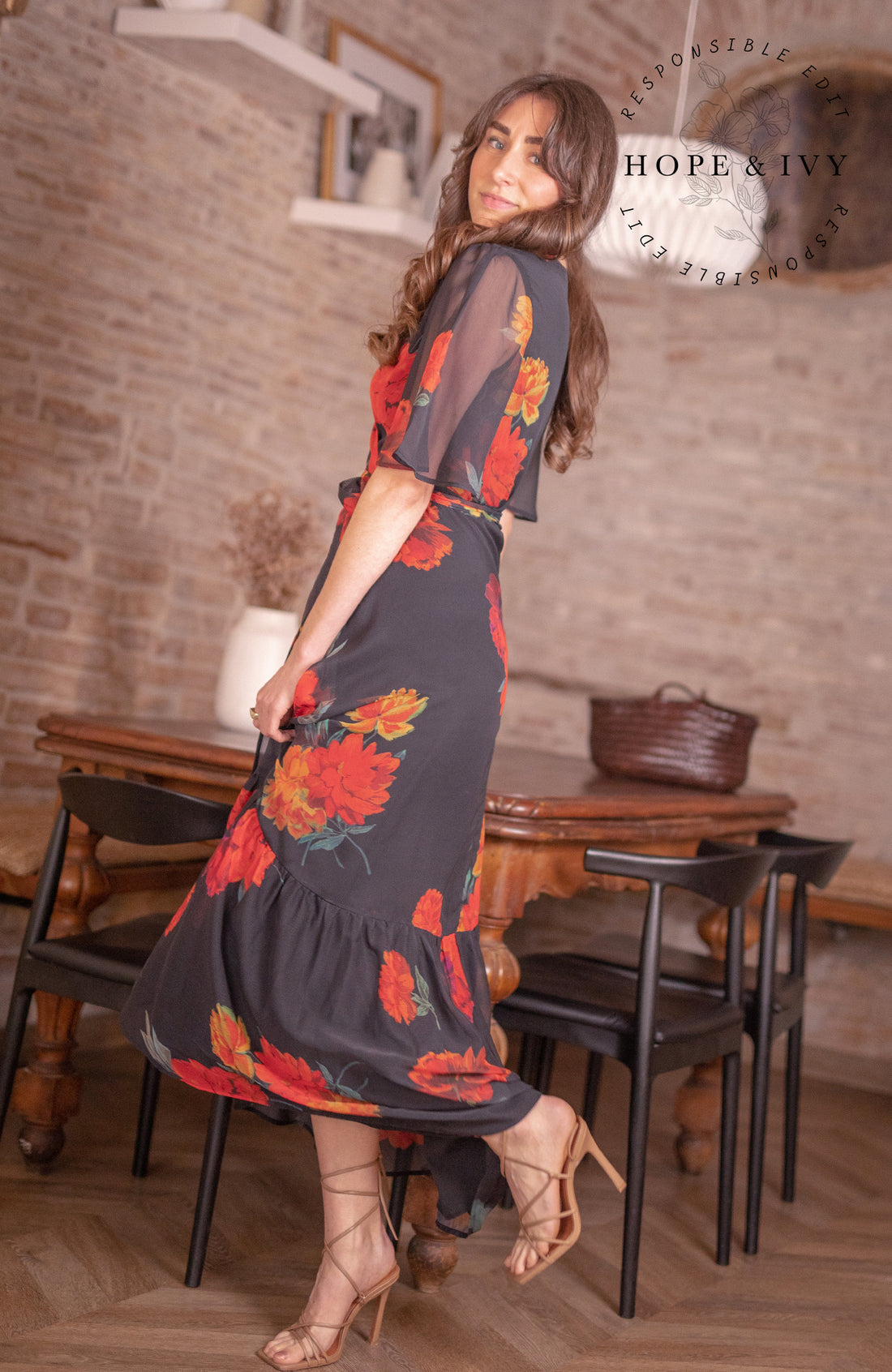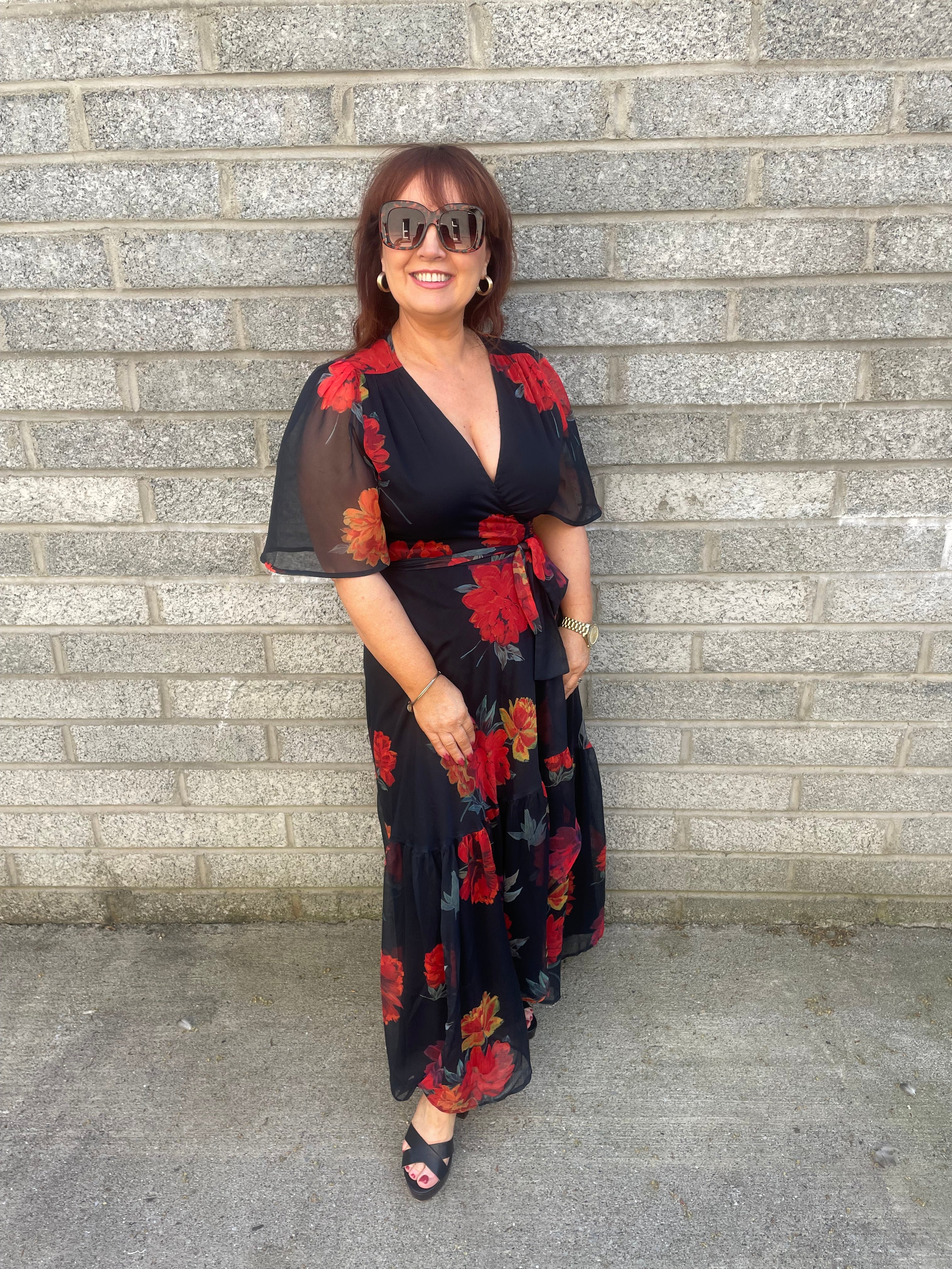 Bold florals adorn a classic black base in this showstopper of a dress from Hope & Ivy Summer 23 collection. The bright hand-designed print depicts oversized blooms in pops of orange and red. With a flutter sleeve, the stylish wrap shape flatters the figure and is finished by a tie waist. The overlay skirt boasts a drop ruffle hem, flowing down to just above the floor length. Stunningly sophisticated.