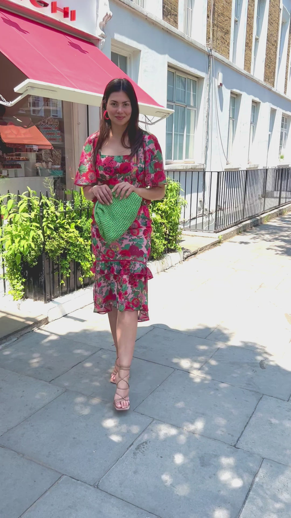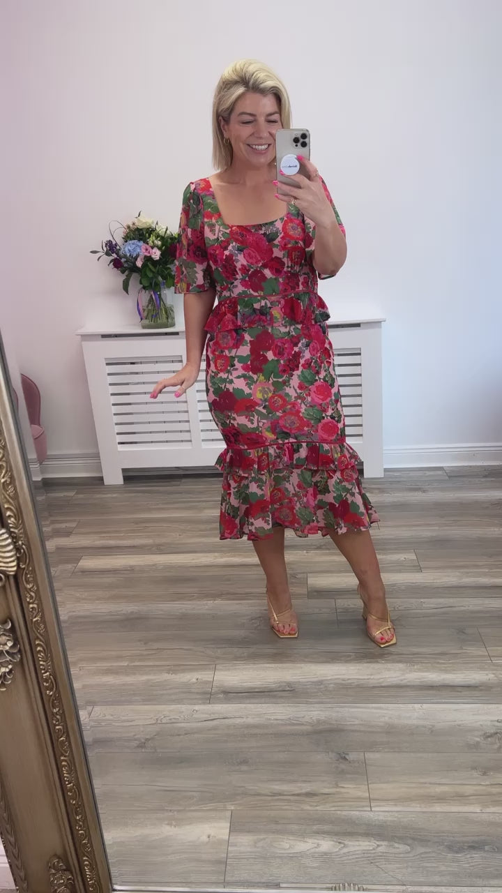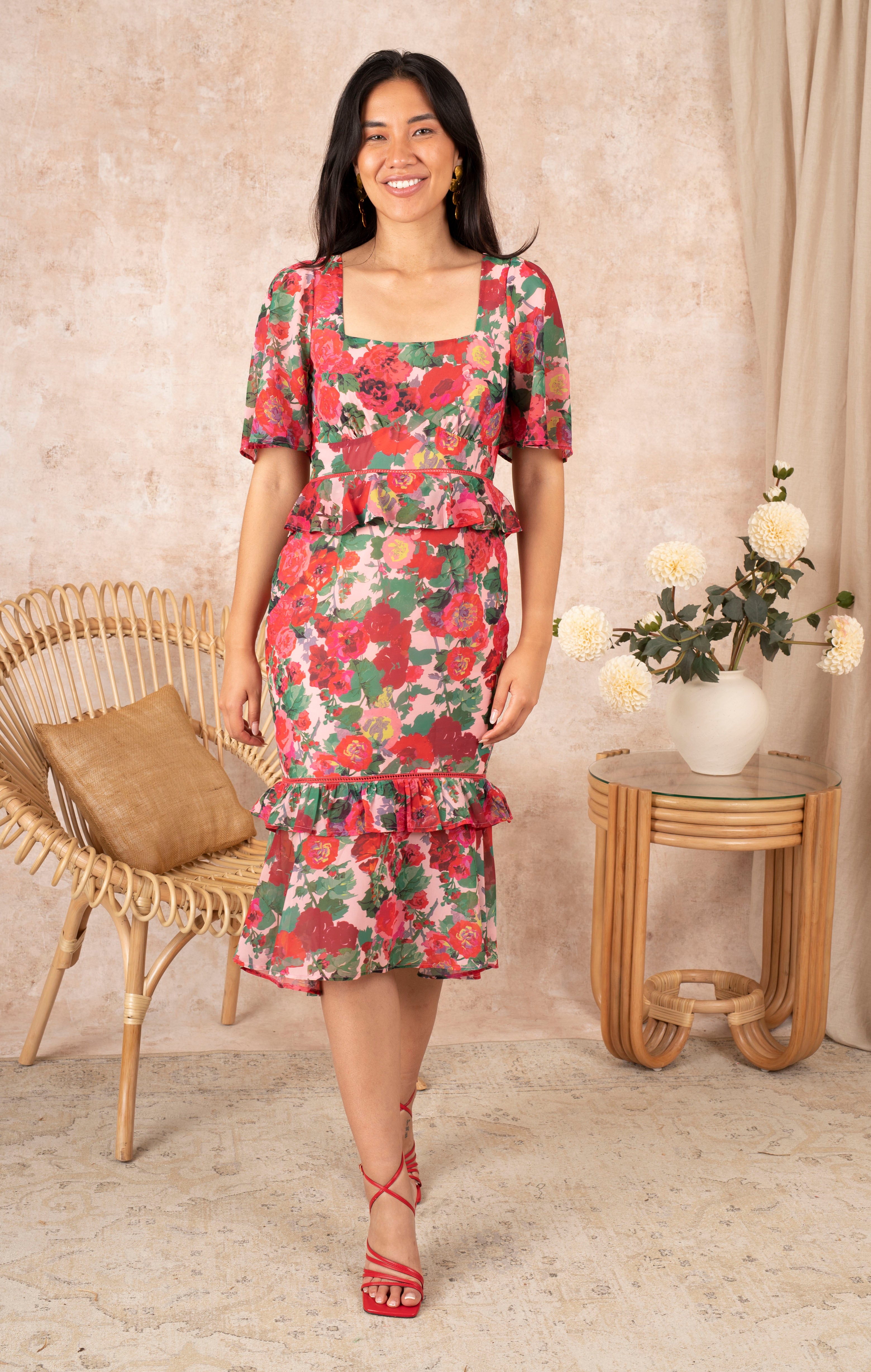This dress is part of an exclusive collaboration between Love Cherish and Hope & Ivy, meaning it is only available in Ireland at Love Cherish. Amorous and alluring, this striking style is a must-have for your summer wardrobe. Colour pop red and green botanicals are strewn over the blush pink base in stand-out hues. The square neckline and peplum waist create a striking silhouette, completed with lace trims and a tiered ruffle skirt that finishes at mid-calf length. This versatile piece can be styled up or down for any occasion. Whatever you’re doing, you’re guaranteed to charm and enchant in this transitional summer piece.