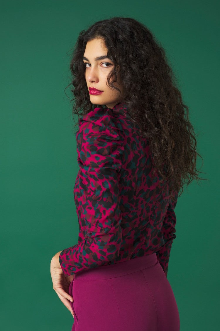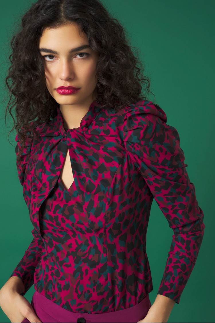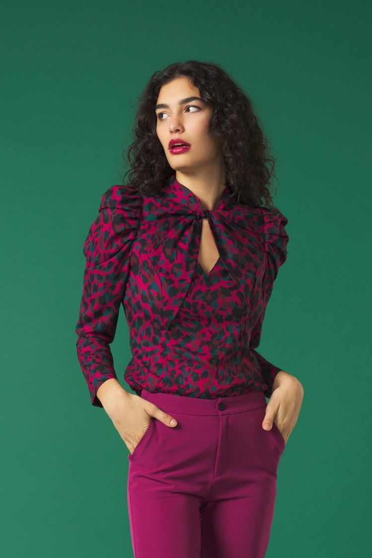 Flaunt a style that features long puff sleeves, a knotted neckline atop a V-neckline, and a convenient back zipper fastening.