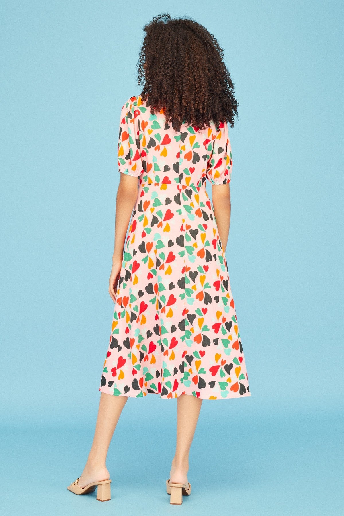 How cute is this midi dress by Minueto! We love the vibrant heart print, the sweatheart neckline and the puff sleeve. Wear casually with runners and a denim jacket or on a night out with a strappy heel. View our Minueto Collection