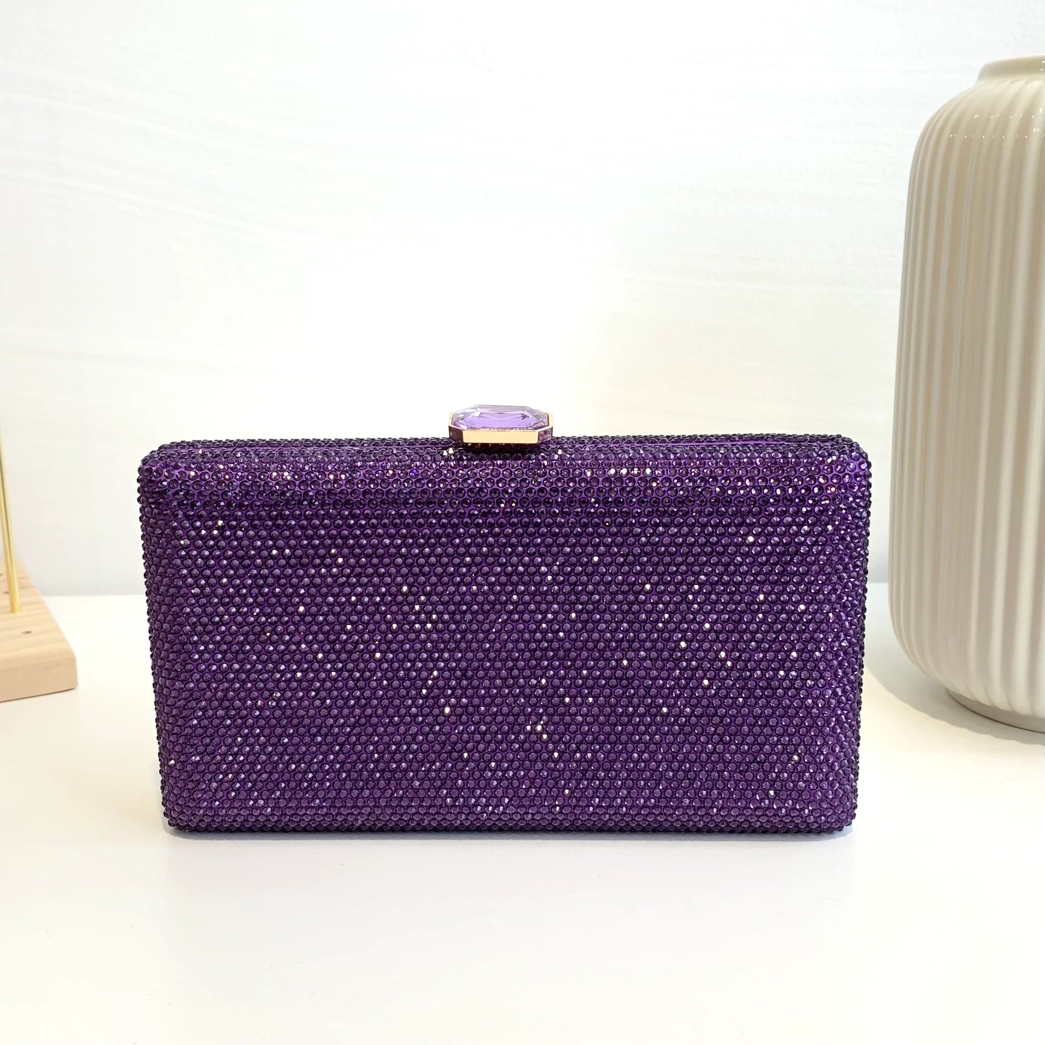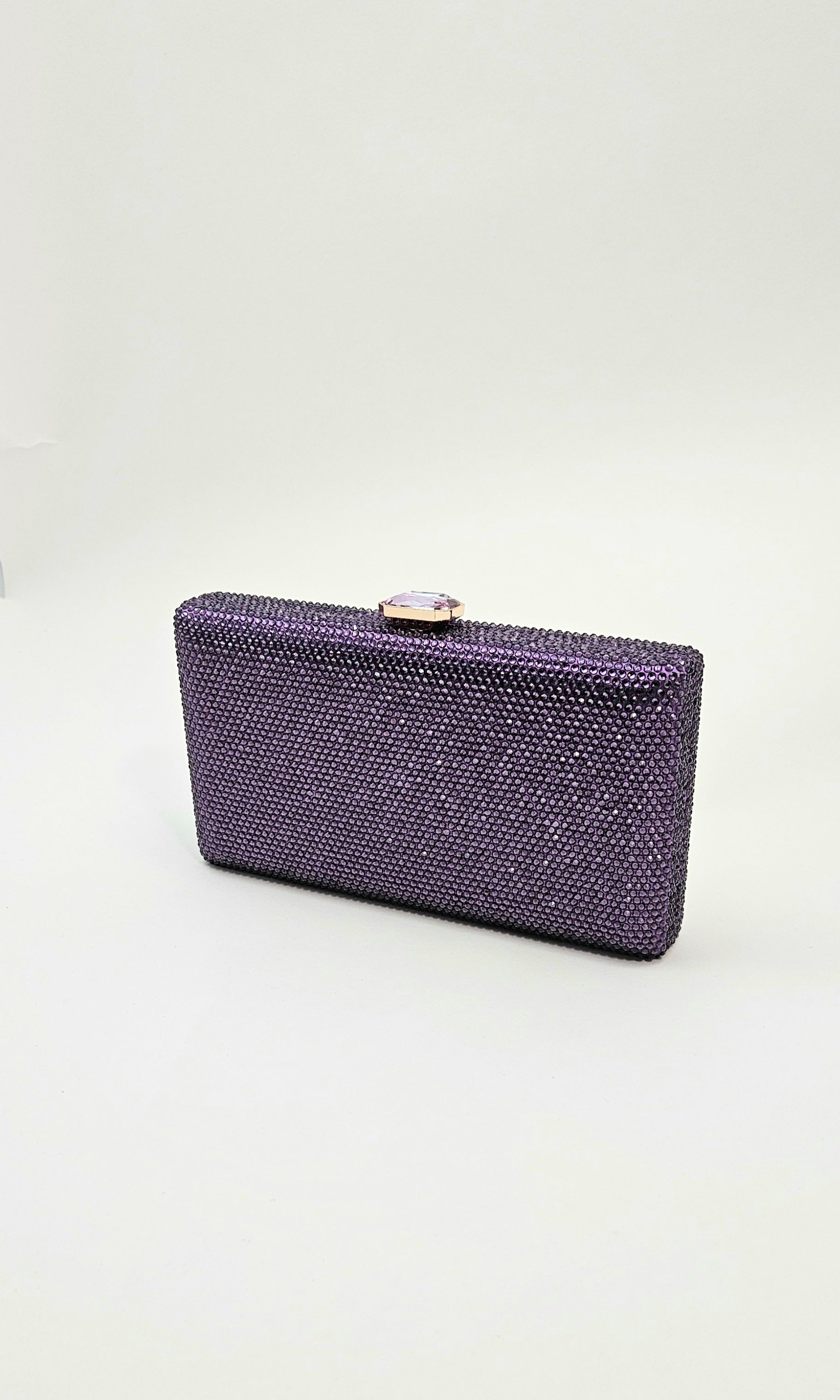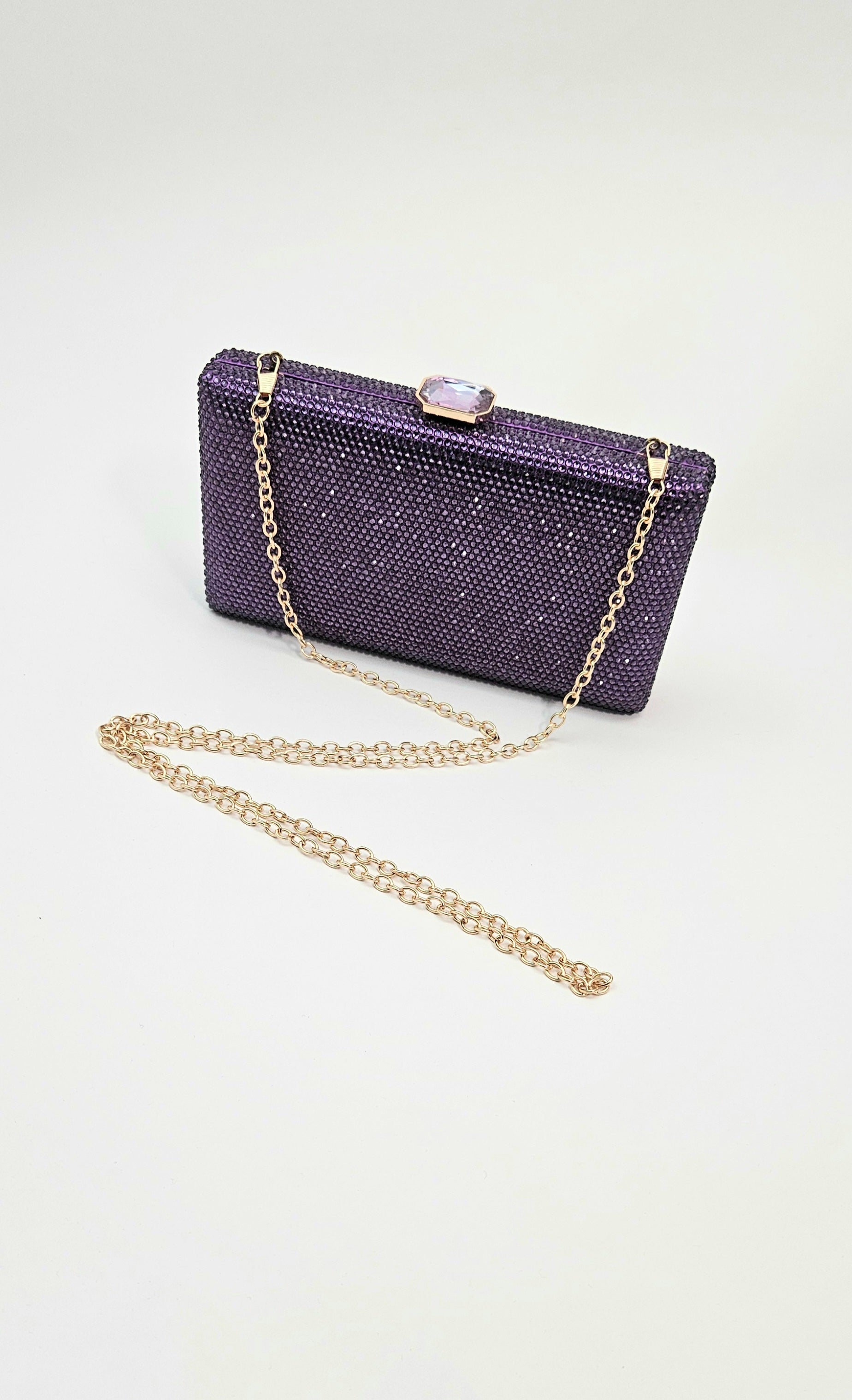 Paved with tiny diamante jewels in striking purple the Victoria is a stunningly sophisticated clutch bag in a structured silhouette with gold hardware for an opulent finish. With one lined main compartment this evening bag is completed with a gold chain strap which can be tucked in for a clutch style or worn over the shoulder.