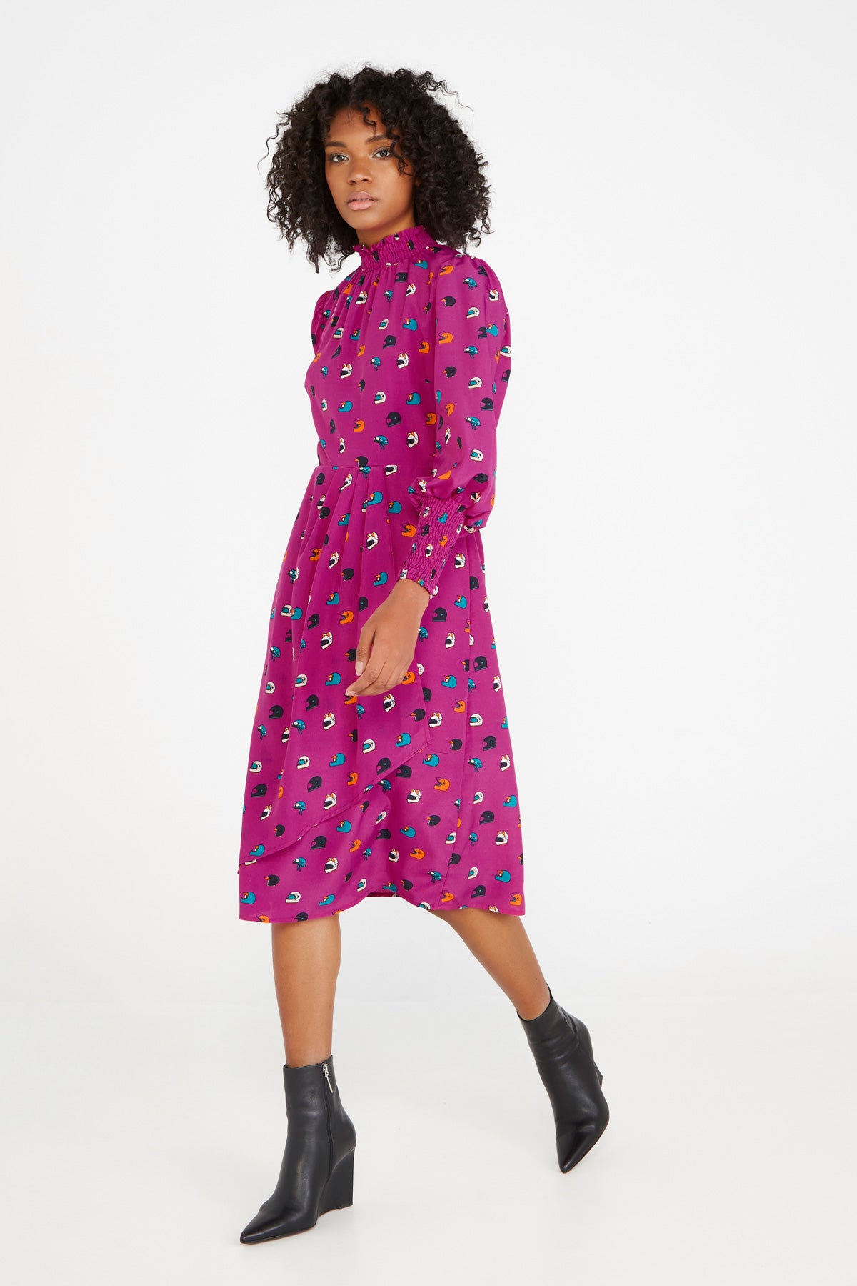 This long puff sleeve midi dress by Minueto features elasticated cuffs, honeycomb neck, crossed effect skirt and back zipper closure.