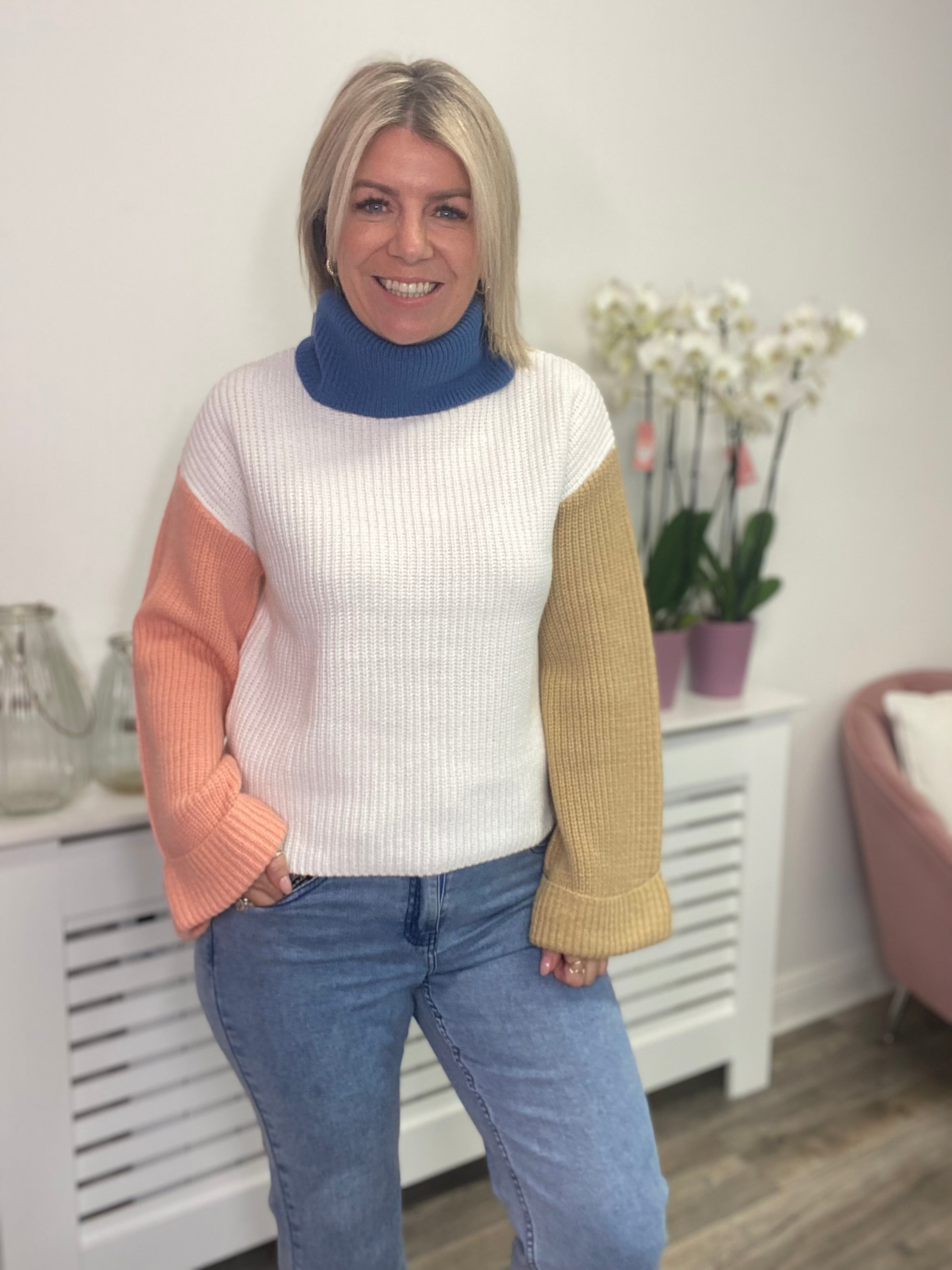 The VINA Roll Neck Jumper is a comfortable choice for cooler days. Made from a stretchy knit it features a colour block design, roll neck, dropped shoulders and is finished with turn-up sleeves. Keep warm in style.