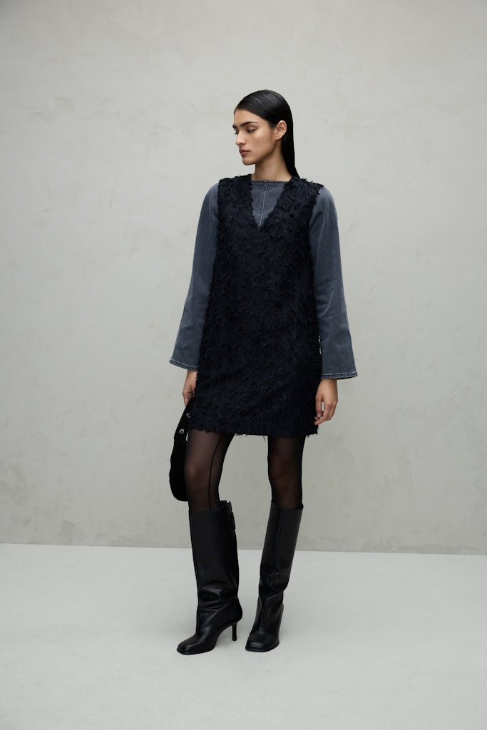 The Wilma mini dress features a V-neck and sleeveless cut. Its textured fabric adds a quirky touch, while fringe accents bring extra flair. Fully lined for comfort, it’s perfect for dancing all night or styling with a top underneath for a chic daytime outfit.