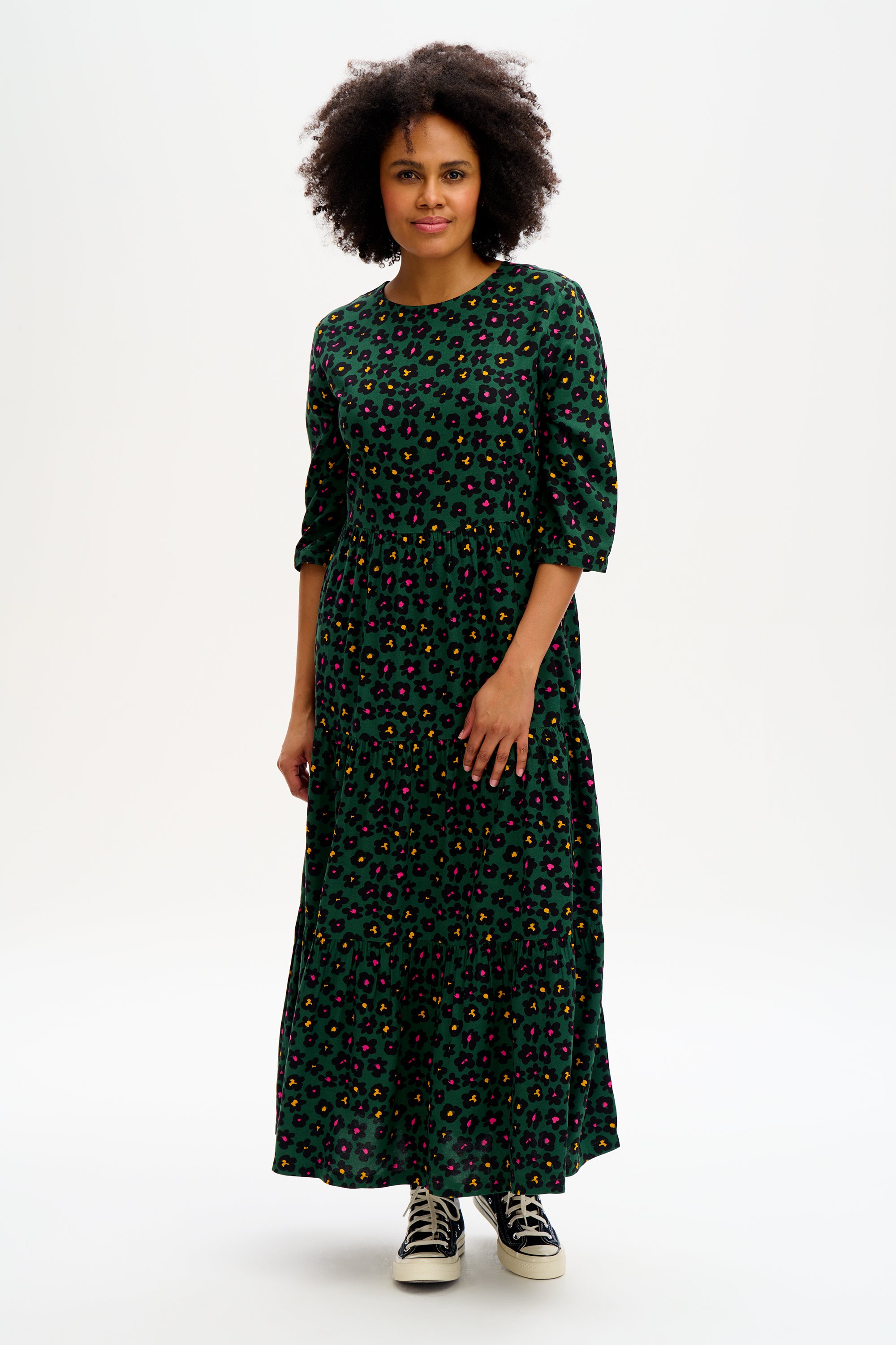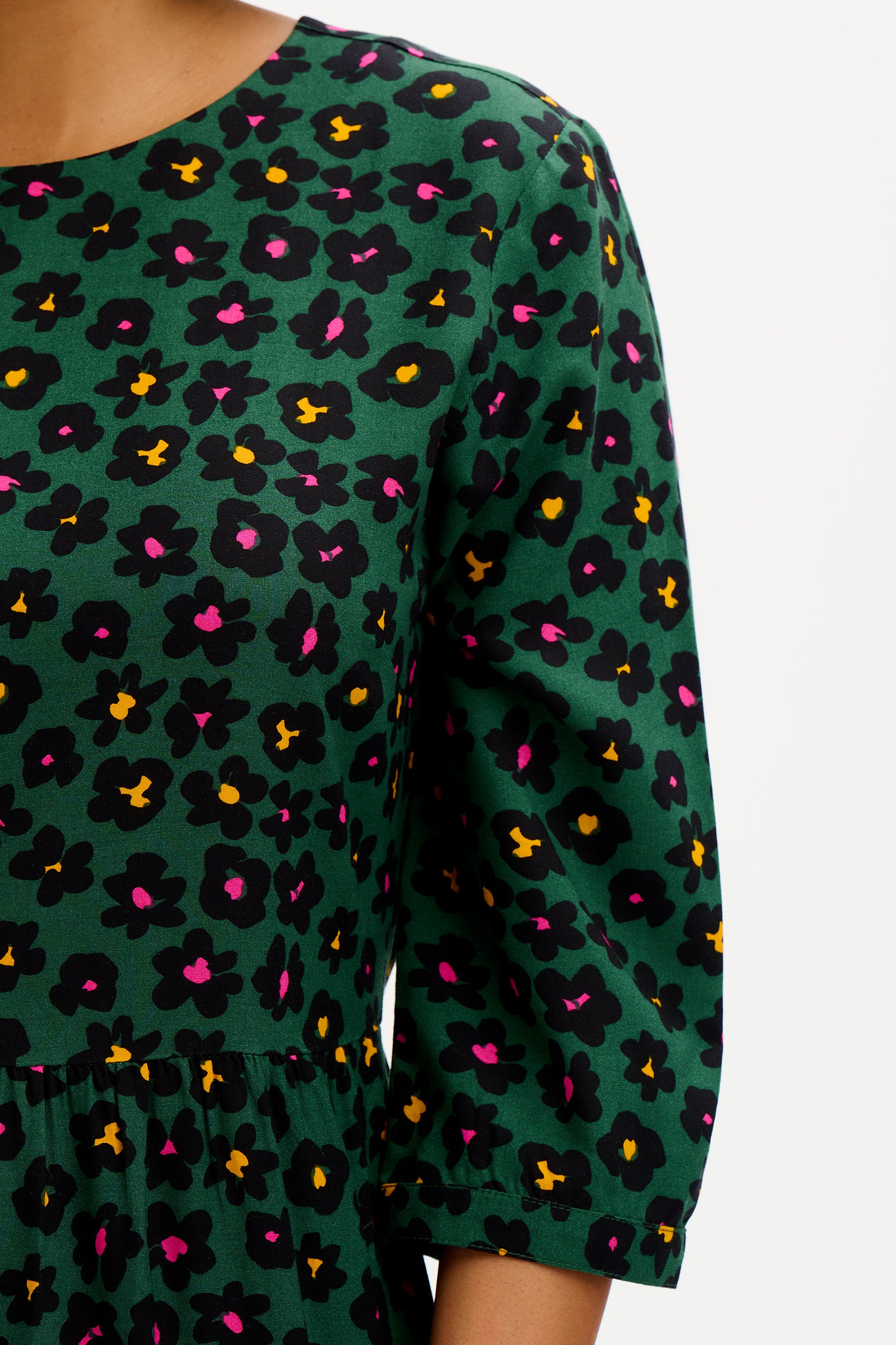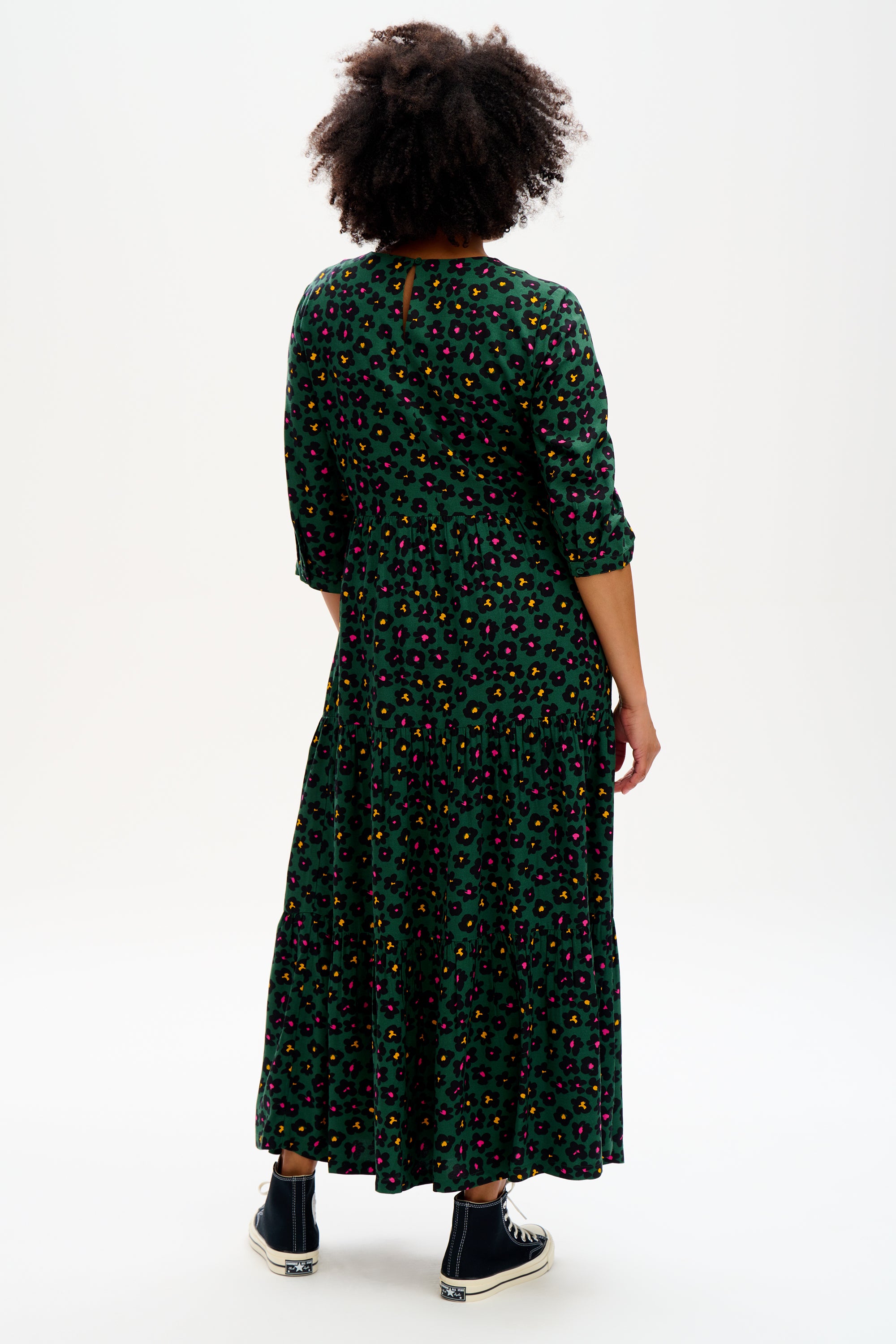 The Green Painted Floral print adds a fun feel to this feminine tiered smock dress. Designed for a relaxed fit, the Zaina falls loosely over the frame. Wear yours with bare legs and trainers now or layered with boots and a leather jacket into Autumn. The Zaina features a simple round neck, half-length sleeves with a slight blouson and a keyhole button back - all in our retro dark floral print.