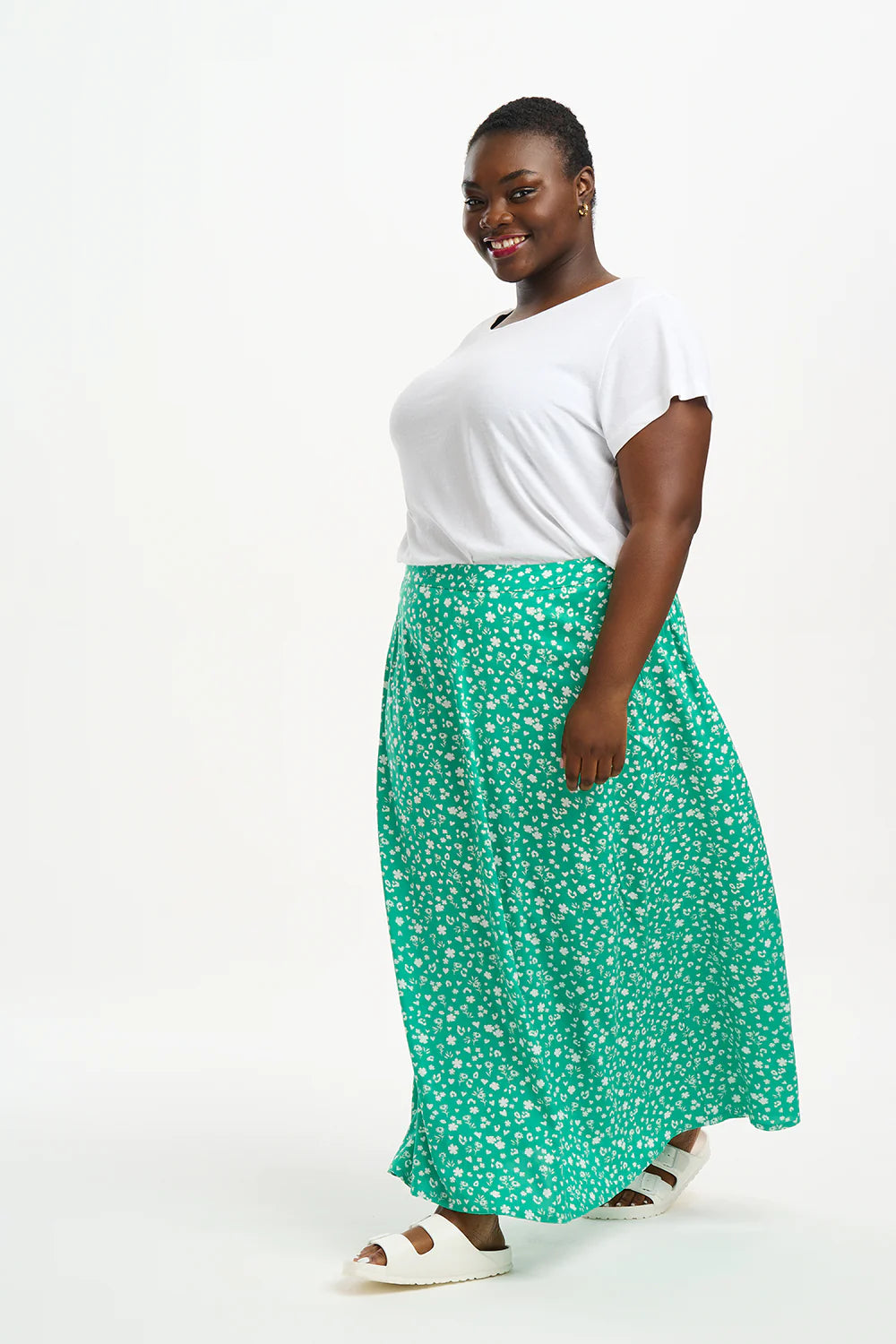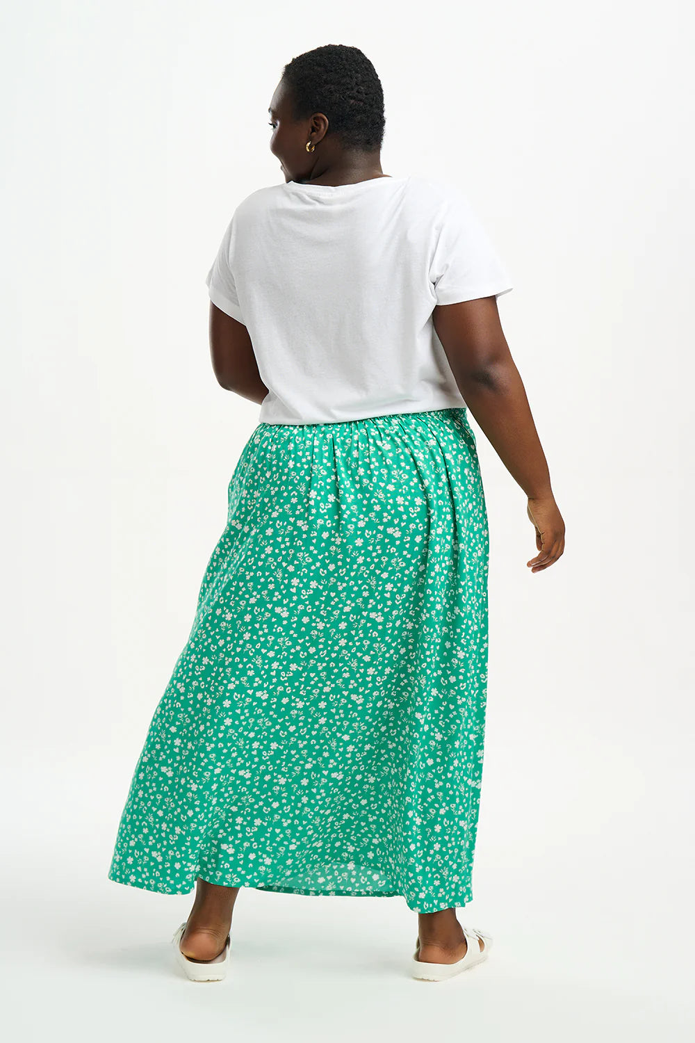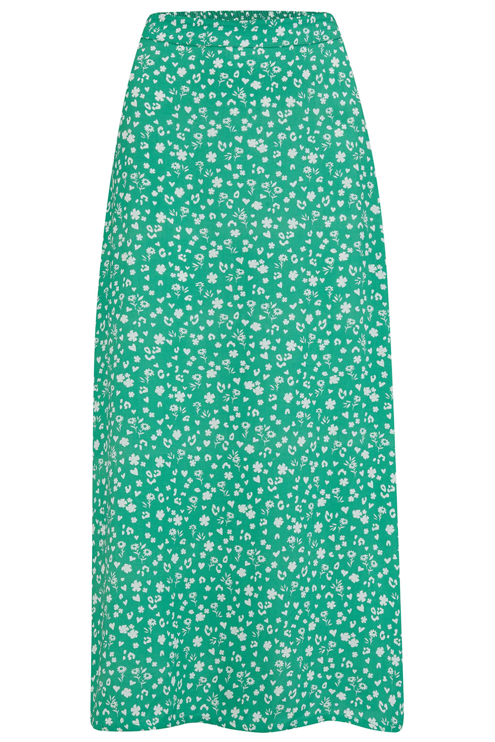 The midi, A-line Zora skirt sits high on the waist with a flat front and an elasticated back for a flexible, comfortable fit. A beautifully delicate design, the Scatter print has a vintage feel with confetti style tiny hearts, flowers and leopard print in white on a green base.
